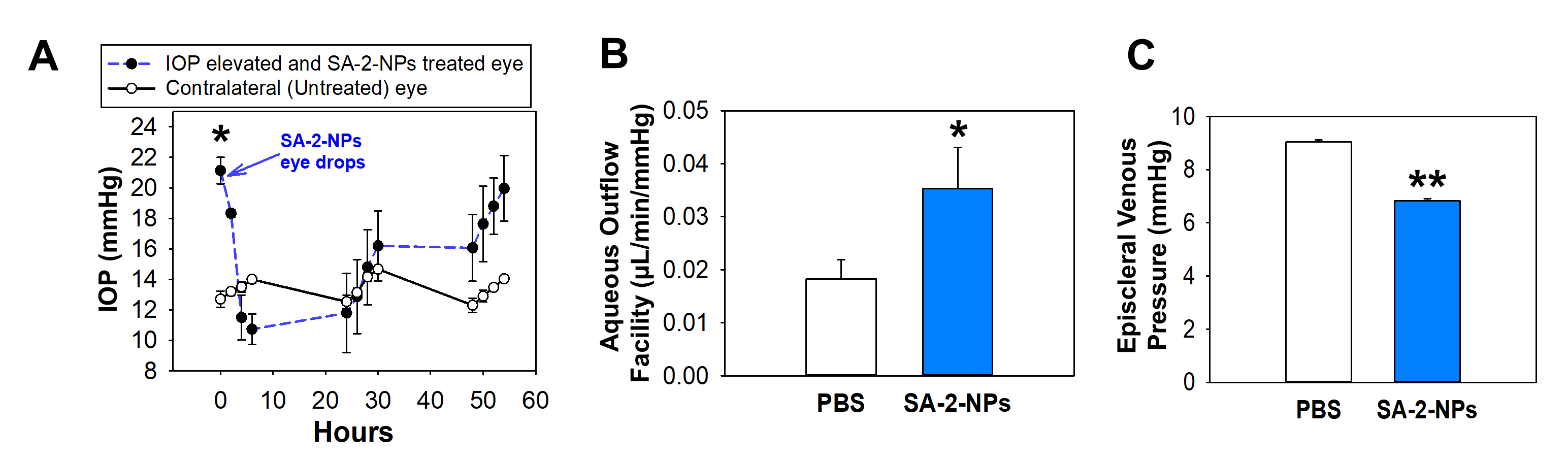 post-hoc paired comparison. B: SA-2 NPs increased aqueous humor outflow facility in OHT mice, *p<0.002, paired t test. C: SA-2 NPs caused a decrease in episcleral venous pressure (Pe), **p<0.001, paired t test. Values are expressed in mean ± standard error of the mean (SEM).