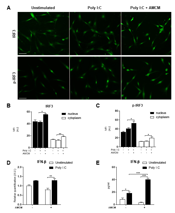 AMCM increased IFN-β synthesis (D) and secretion (E) in poly I:C–stimulated HLMs. Bars represent the mean ± standard error (SE); ***p<0.001, **p<0.01; *p<0.05. All assays were