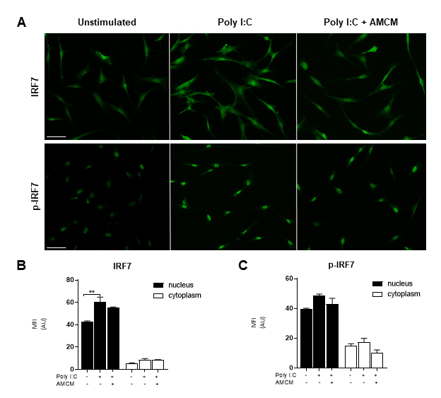 (MFI) in each condition was achieved as described in the Materials and Methods section. B: AMCM did not exert any change in the presence of IRF3 in the nucleus and the cytoplasm in poly I:C–stimulated human limbal