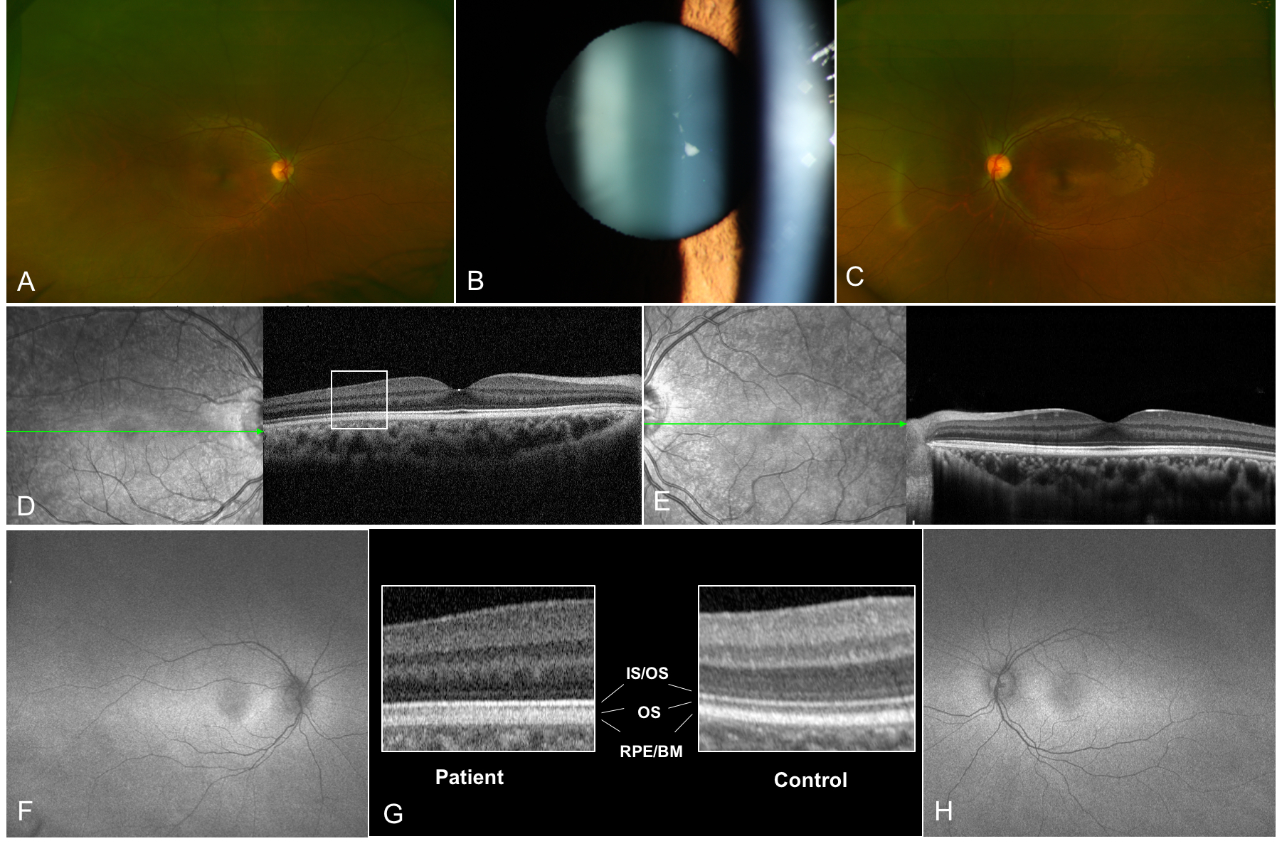 RPE/BM layer has a blurred rather than a sharp appearance. F: Short-wave autofluorescence of the right eye is normal. G: Enlargement of right eye SD-OCT with control. H: Short-wave autofluorescence of the left eye is normal.