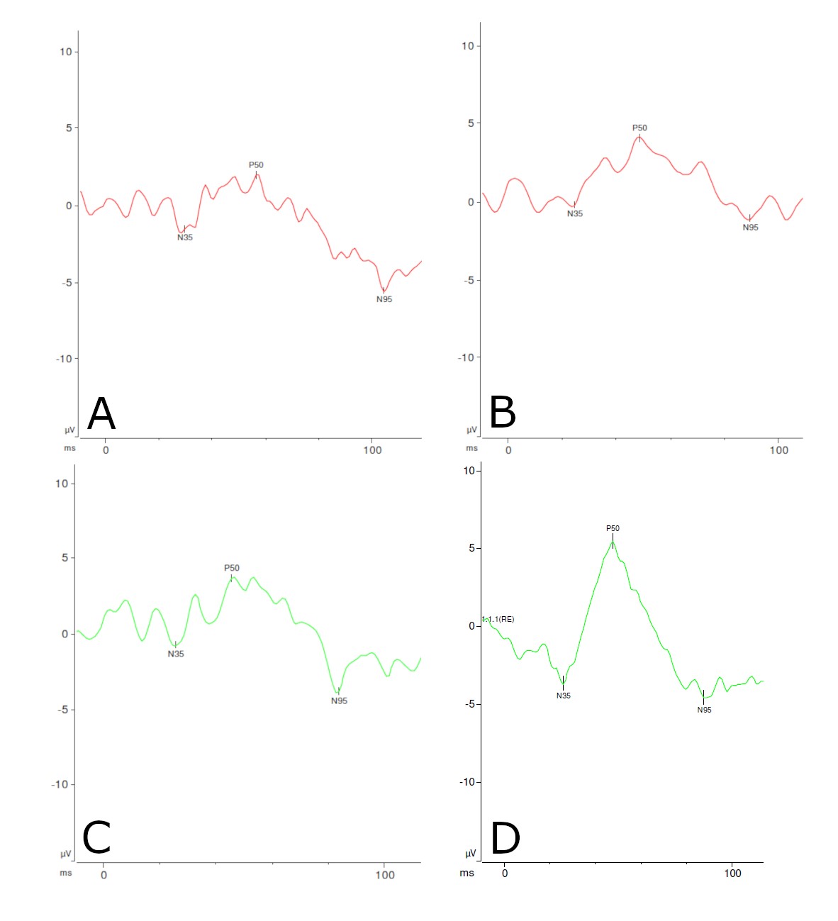 N95 amplitude), indicative of macular photoreceptor dysfunction. The left eyes were similar. D: The right eye of a control subject.