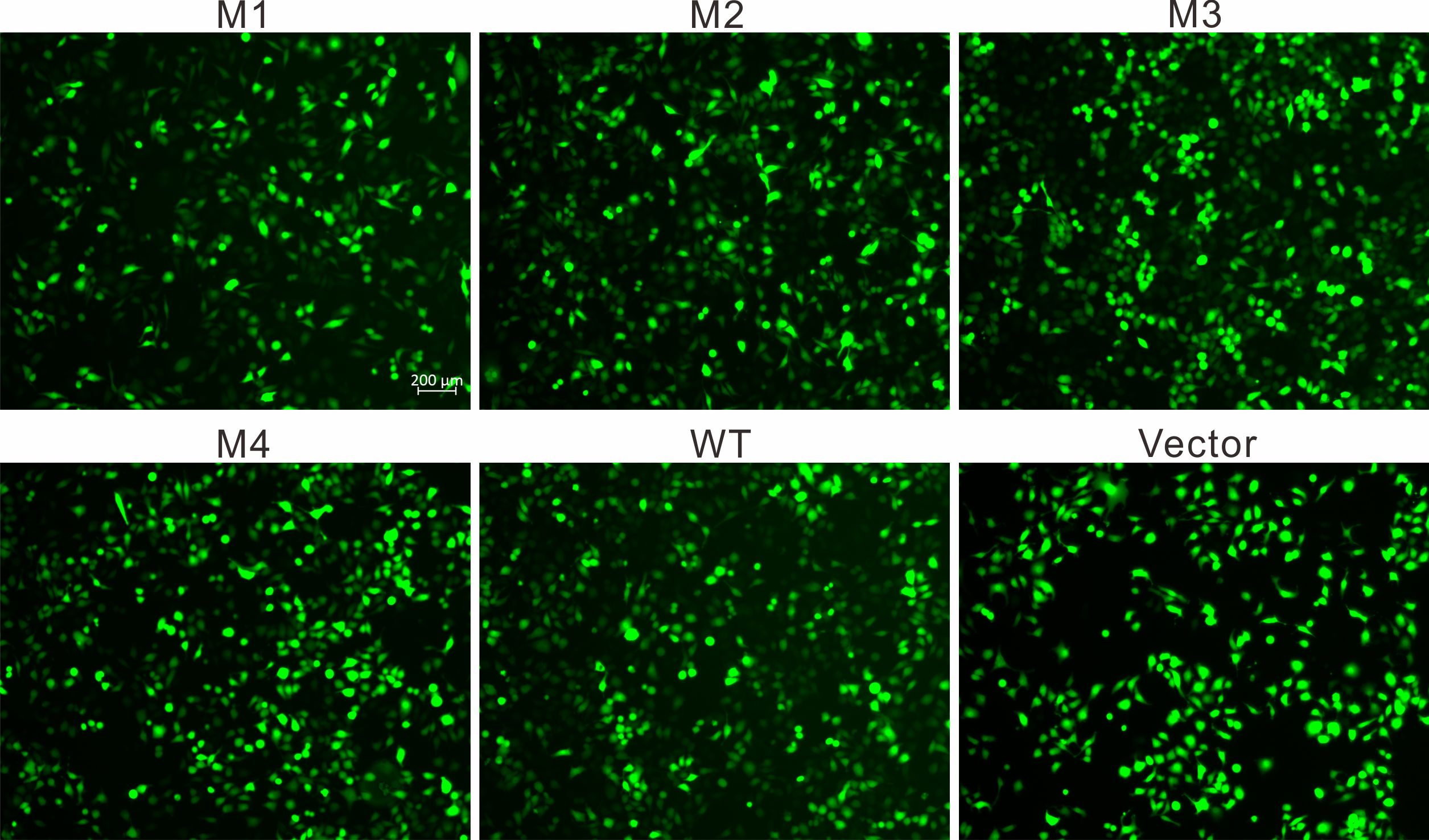To access the data, click or select the words “Appendix 3.” The green fluorescent images of the cells overexpressing WT, M1-M4-EPHA2 and vector plasmid only (as the constructs contain EGFP). Scale bar, 200 µm.