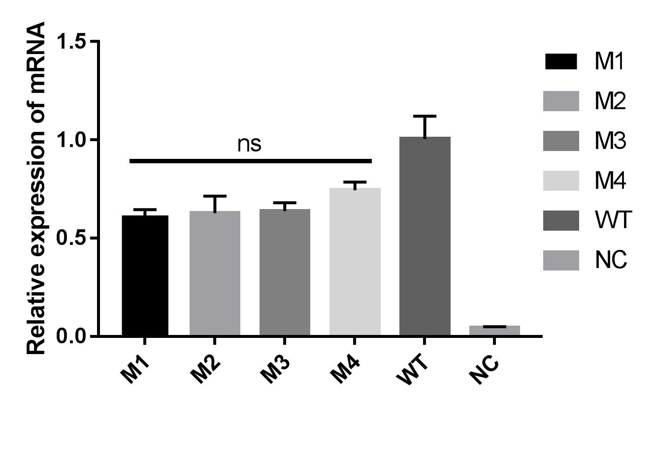 To access the data, click or select the words “Appendix 5.” The mRNA levels were measured using qPCR. Endogenous gene control: β-actin, sample control: WT, n=3. rs35903225, M1; rs145592908, M2; rs137853199, M3; rs116506614, M4. ns: not significant.