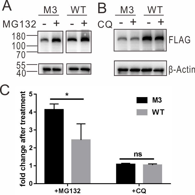 Figure 3. MG132 recovered M3-EPHA2 to a greater level than WT did. After treatment with MG132 or CQ, the levels of M3 and WT EPHA2 were