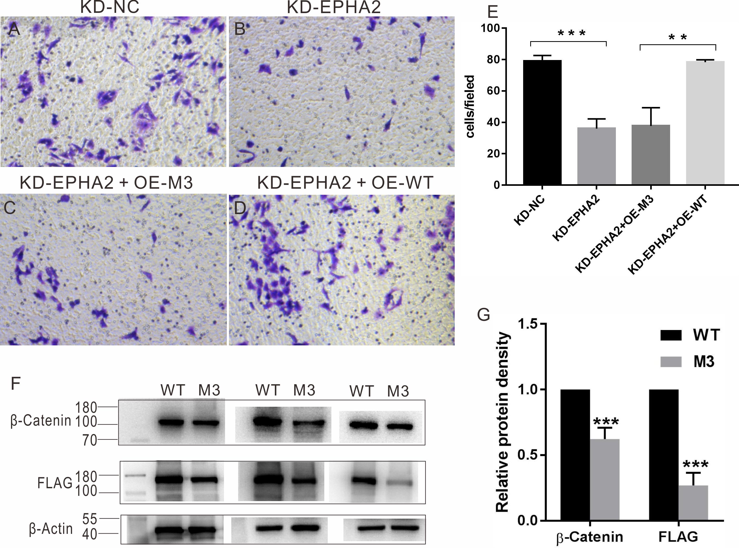 of WT-EPHA2. C, WT-EPHA2 overexpression restored cell migration ability to a normal level (A). D: M3-EPHA2 overexpression did not rescue the reduced cell migration ability of the EPHA2 kDa cells . E: Quantification of the transwell assay images; five fields were counted in each insert well, n = 5, ***p<0.001, **p<0.01.