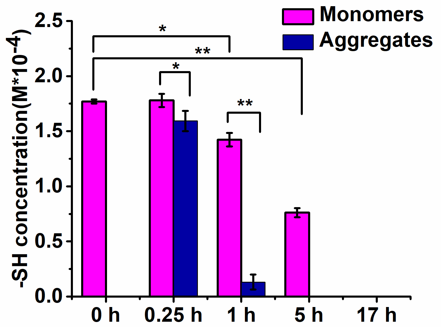 Figure 6. Ellman’s assay to determine free sulfhydryl groups (-SH) groups in monomers and aggregates collected at different time points.