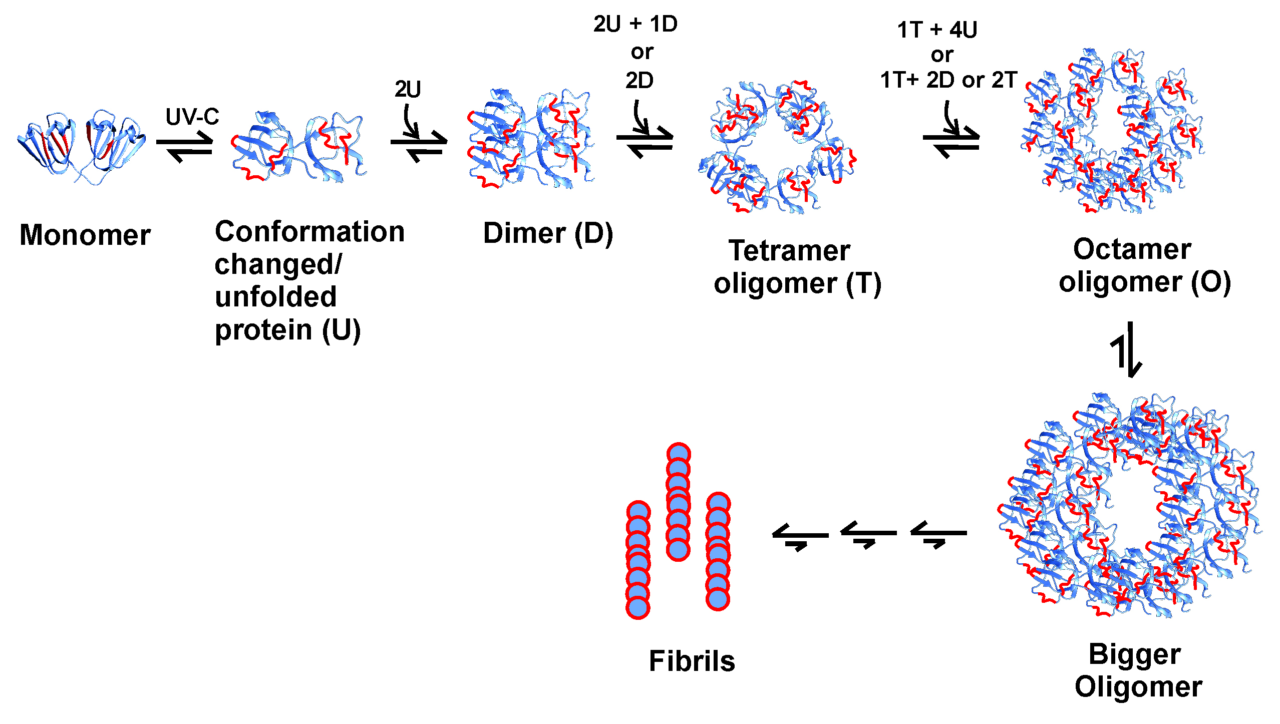 Proposed aggregation pathway for aggregation of γD-crystallin protein in UV-C light. Monomer PDB id is 1HK0; all other images are only for representative purposes. Red shows the hydrophobic patches in the protein.