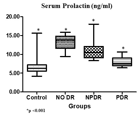 diabetic retinopathy (n=15) and controls (n=15)] showing decrease in serum prolactin levels with severity of diabetic retinopathy.