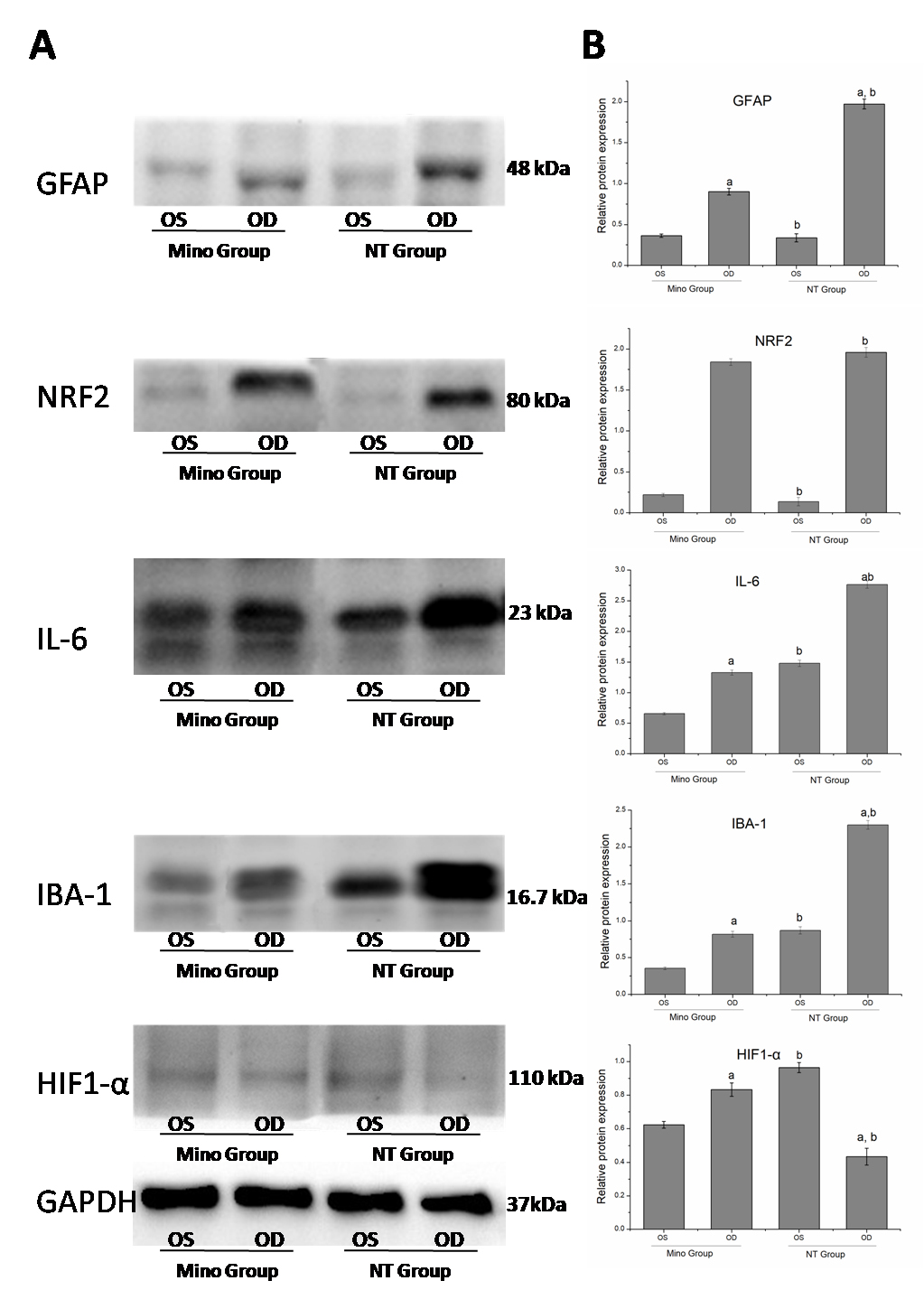 Figure 11. Western blotting (left) and quantification (right) of GFAP, NRF2, IL-6, IBA-1, and HIF-1α protein expression profiles in the