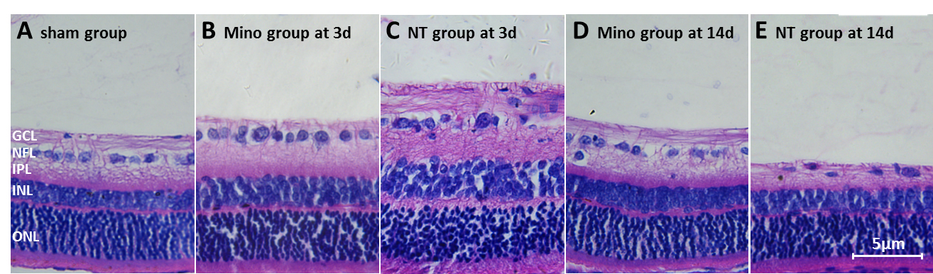 Figure 3. H&E staining for the retina of the non-minocycline treatment group and the minocycline treatment group at 3 days and 14 days