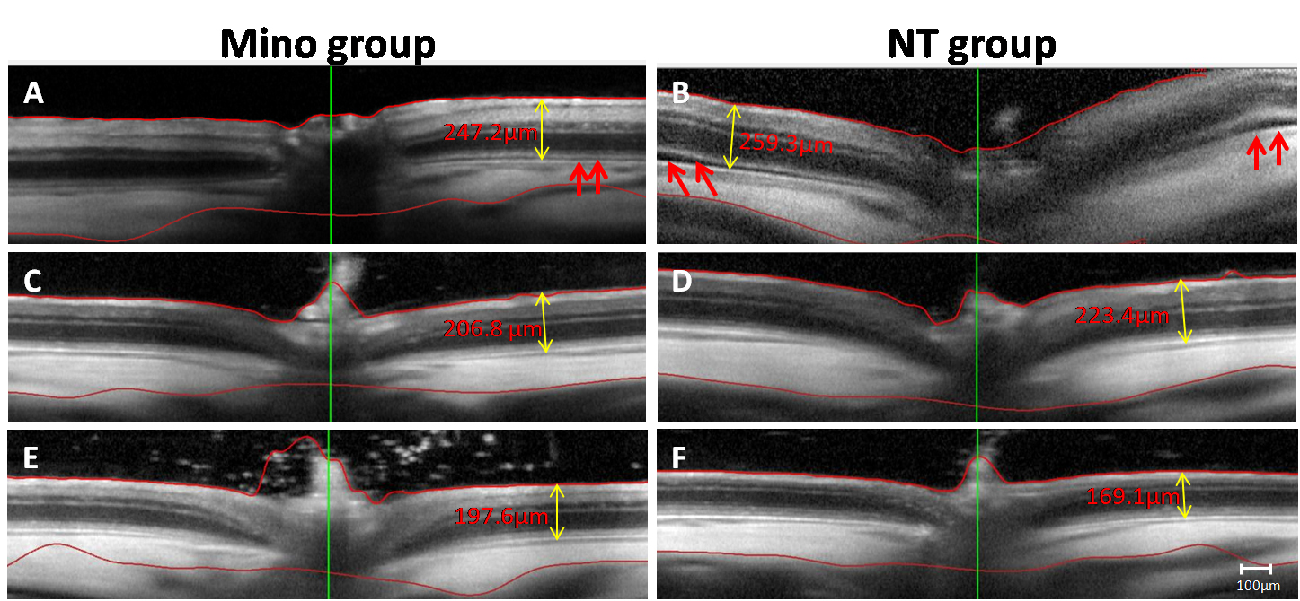 (Mino) group and the no treatment (NT) group. C, D: At 3 days after IR, the retina of the NT group was thicker than that of the Mino group. E, F: At 14 days after IR, the retina of the NT group was thinner than that of the Mino group. n = 6. Scale bar: 100 μm.