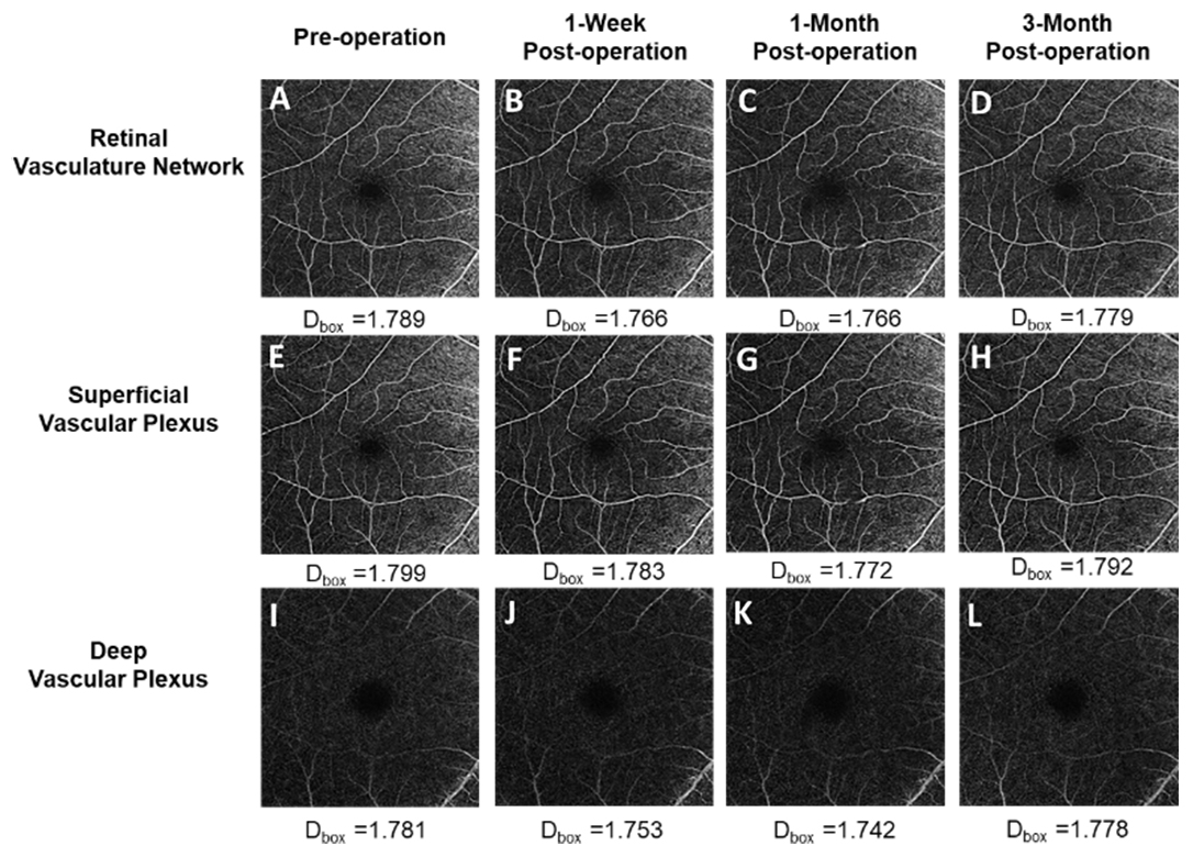 3 months postoperatively). E–H: The images show the superficial vascular plexus (SVP). I–L: The images show the deep vascular plexus (DVP) at the three time points described above.