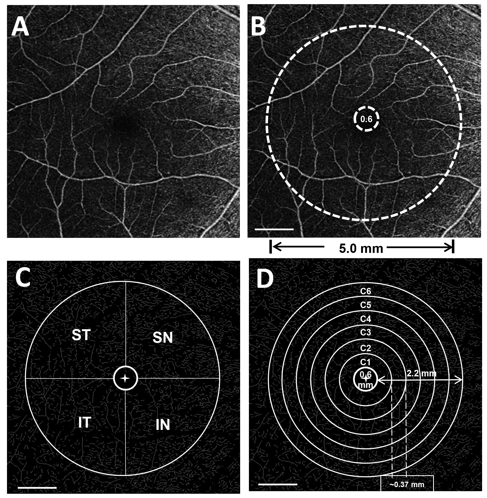 Figure 4. Fractal analysis of OCTA images. A: The raw OCTA image used for analysis. B: Annular zone (0.6–5.0 mm) for fractal analysis of vascular density in 6 x 6 mm2 OCTA images. C: Image processing after four quadrant zones were generated after removing the FAZ (diameter = 0.6 mm). ST, superior temporal;