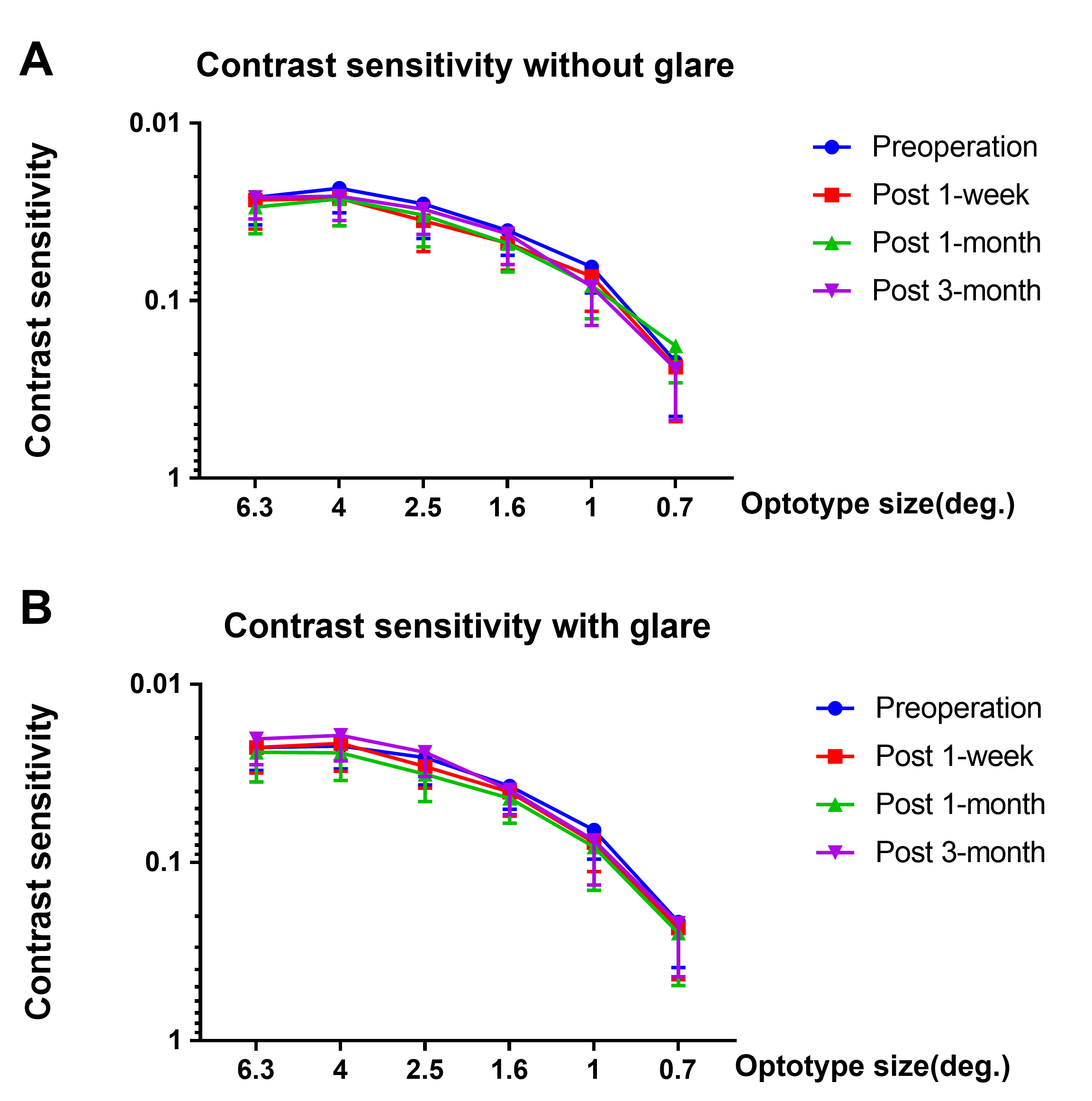 Figure 6. Preoperative and postoperative contrast sensitivity (CT) of 32 patients. A: No statistically significant difference was found in contrast sensitivity without glare at six different visual angles (p>0.05).