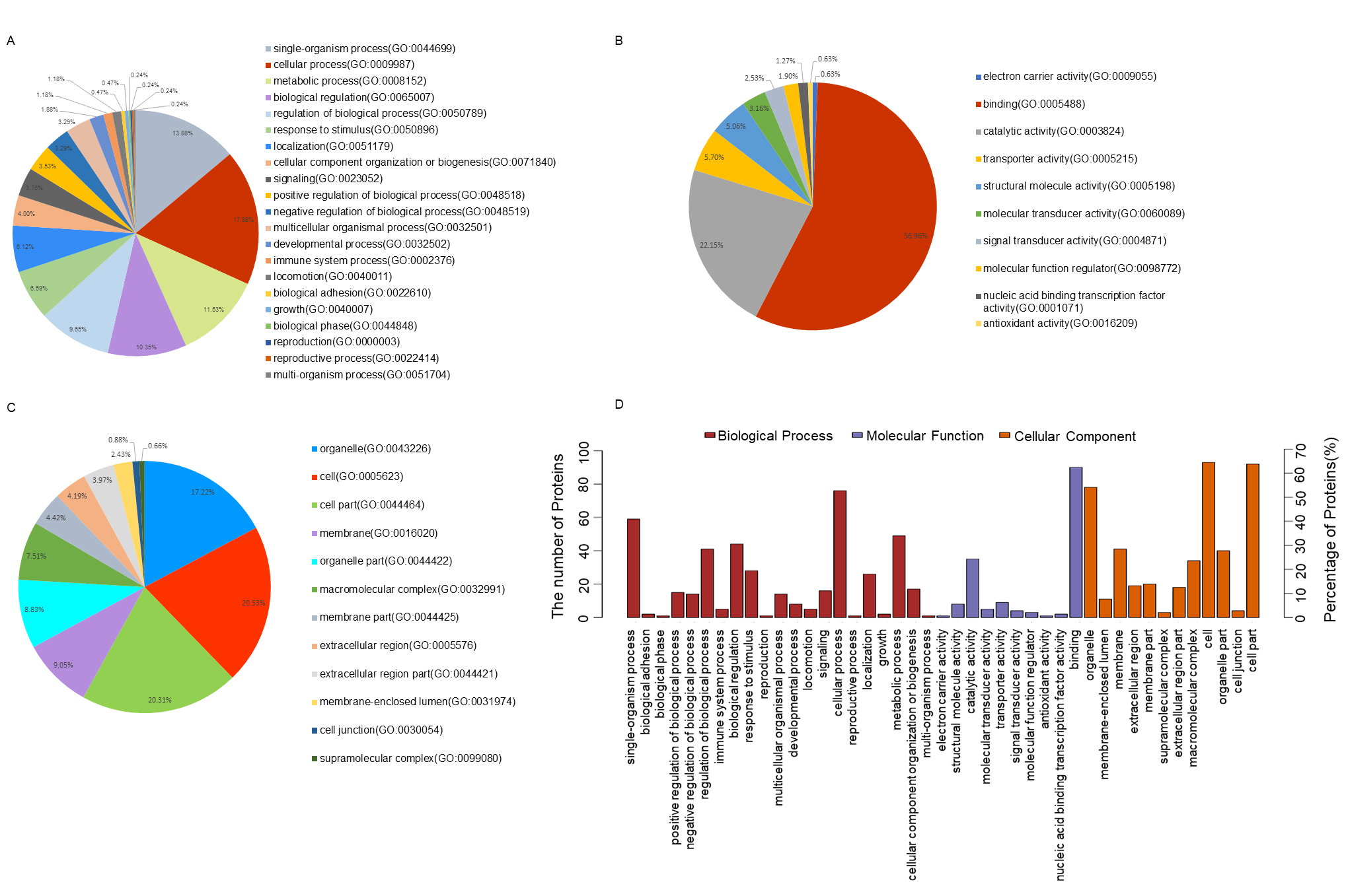 Figure 3. GO annotation and functional classification of differently expressed proteins. A: Biological process. B: Molecular functions. C: Cellular components. D: The summary of the number and percentage of proteins involved in biological process, molecular functions and cellular components.