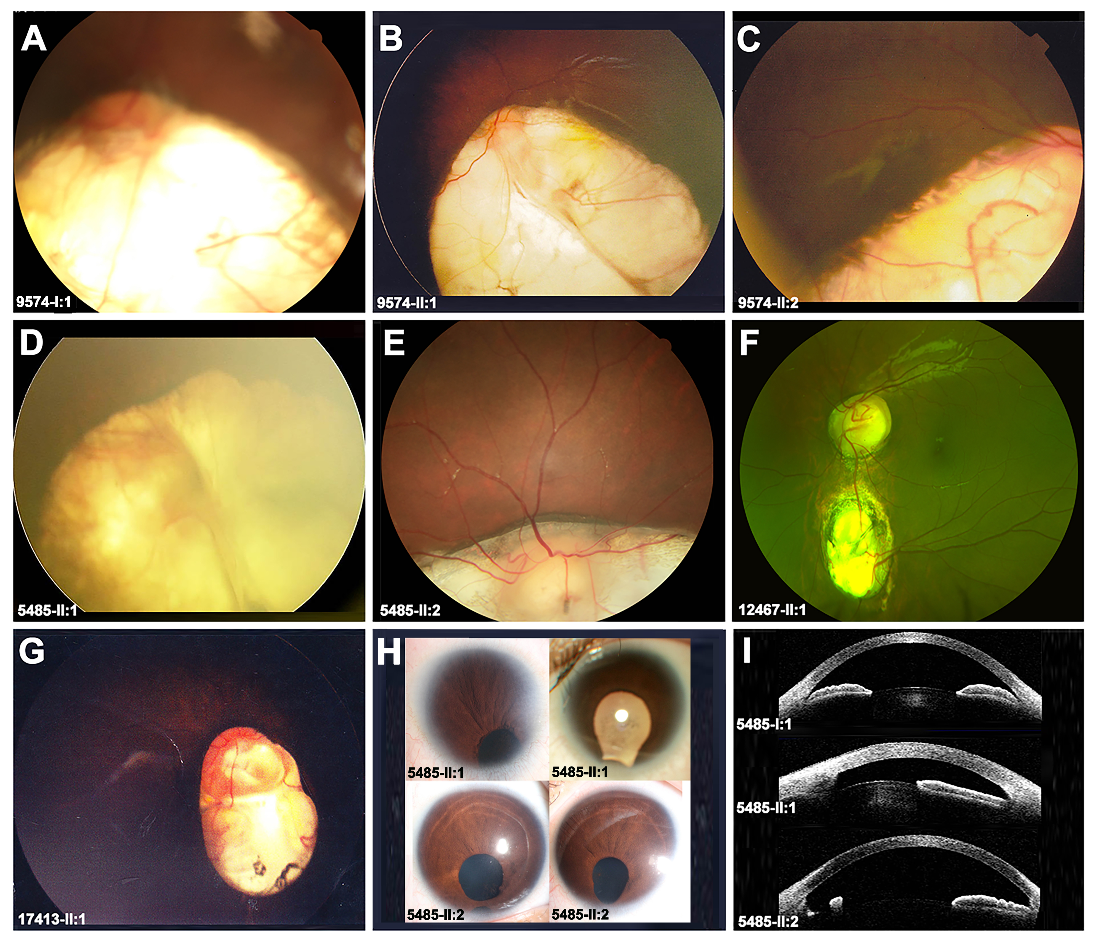 12467-II:1, 17413-II:1). H: The proband (5485-II:1) had microcornea with iris coloboma in both eyes and his sister (5485-II:2) had inferior iris coloboma