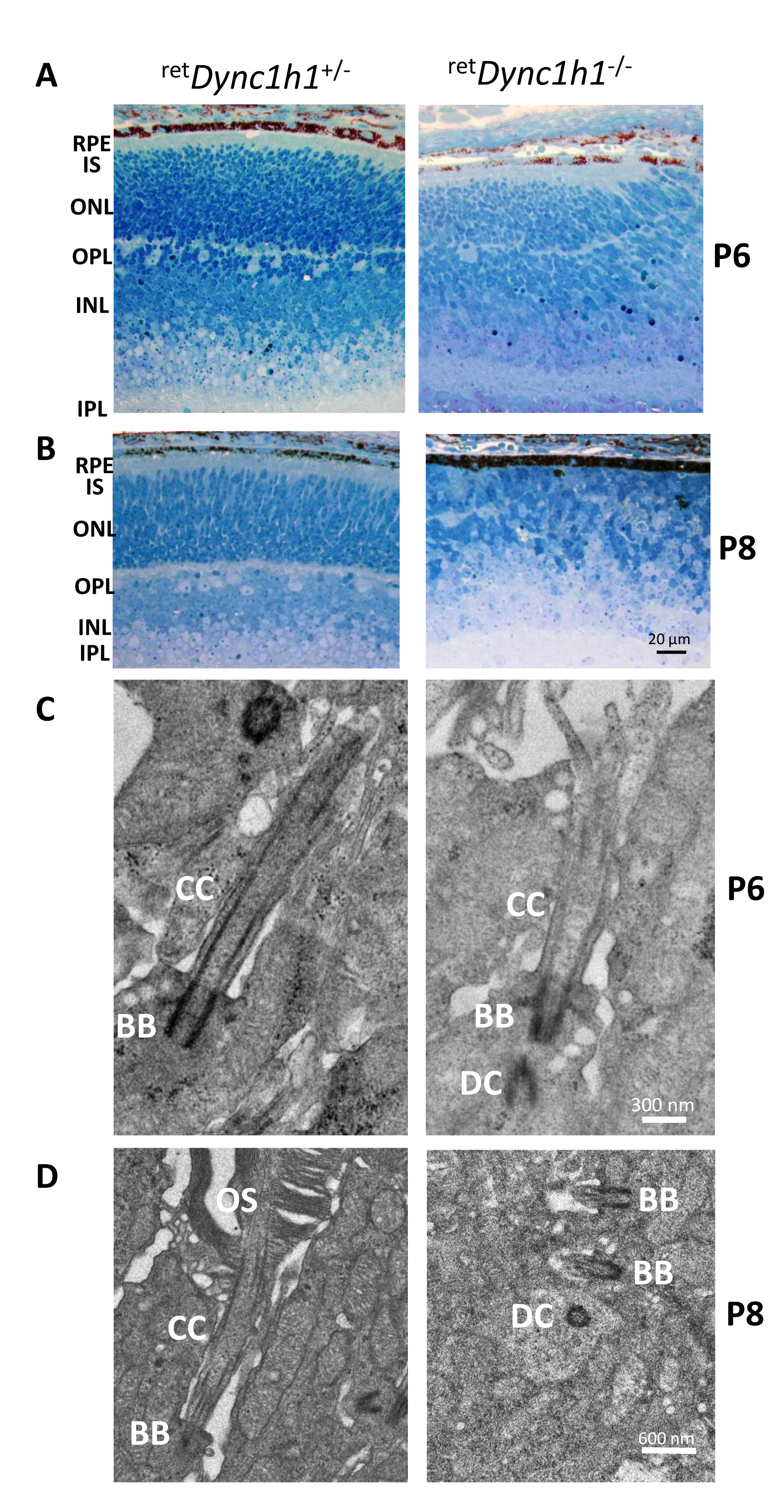 retDync1h1−/− (right) mice at P6 and P8. Sections are stained with methylene blue-Azure II (Richardson’s) to demonstrate the retina layers.