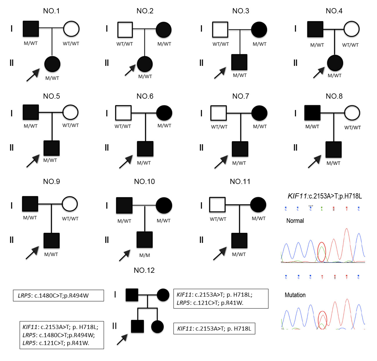 Figure 1. Pedigrees and chromatograms of the KIF11 mutation c.2153A>T (p. H718L). In the pedigrees, M sign represents a variant; wild type (WT) represents a normal allele;