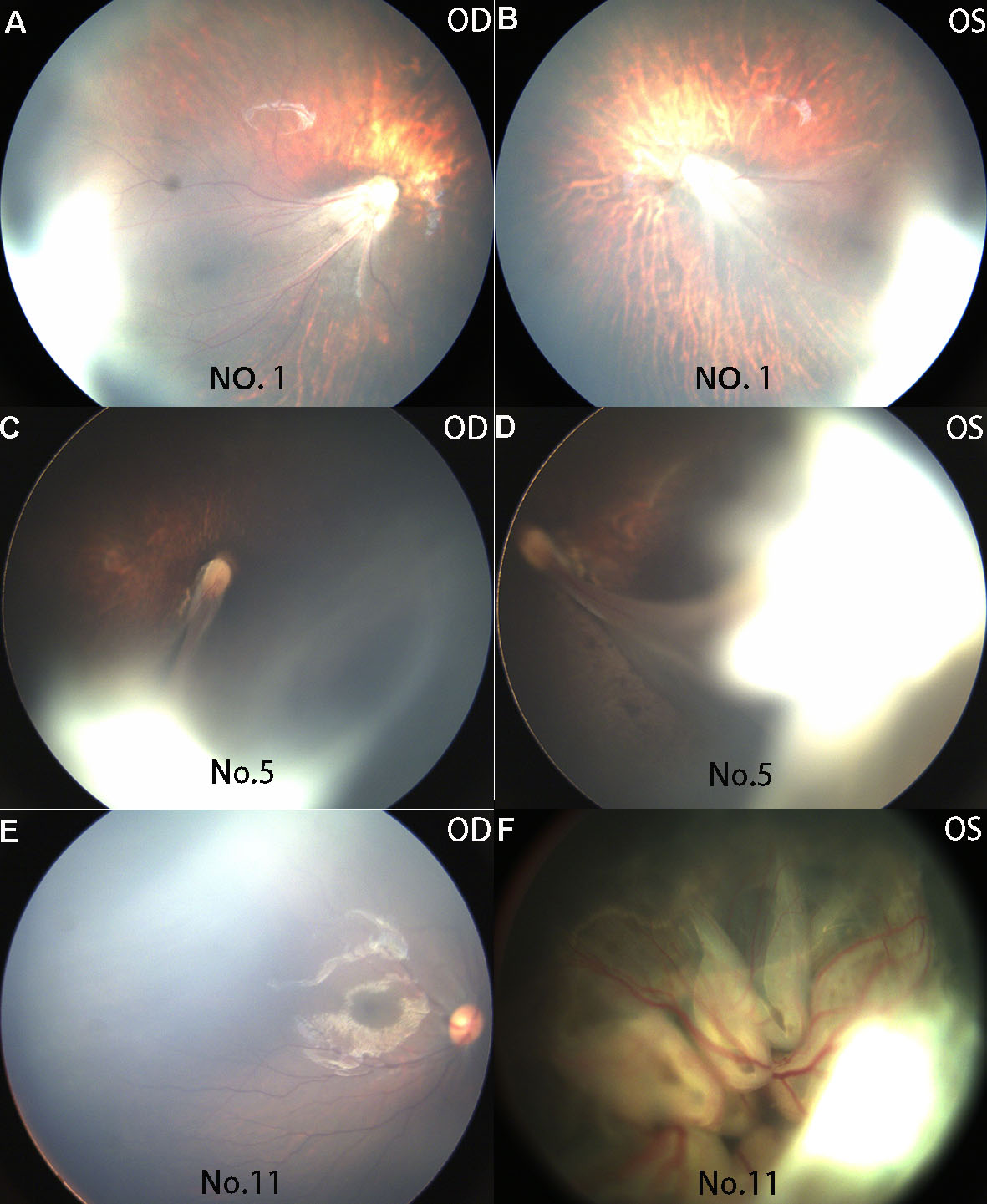 Figure 2. Representative fundus presentations of patients with the KIF11 mutation c.2153A>T (p. H718L). Ocular phenotypes included temporal disc dragging (A, B), knife-like retinal fold (C, D), aberrant peripheral retinal vessels (E), and total retinal detachment (F). The patient number is marked at the bottom of each fundus photo. OD and OS represent the right and the left eye, respectively.