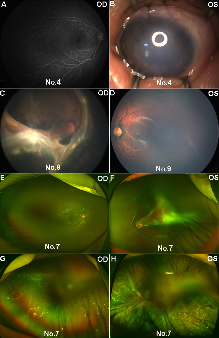 in the left eye. G, H: Proband 7: During follow-up, the retinal fold progressed to exudative retinal detachment gradually in the left eye of Proband