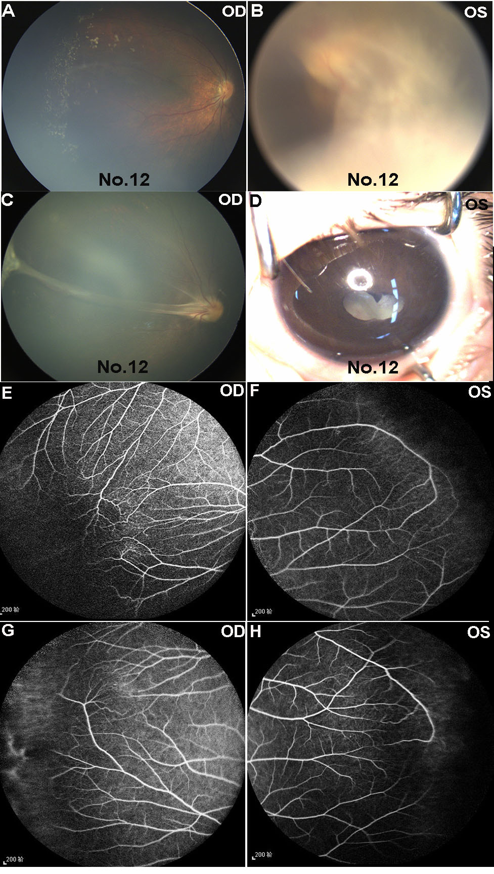 OD and OS represent the right and left eye, respectively. E, F: Peripheral aberrant vascularization and avascular zone are observed in the proband’s affected father (LRP5 mutation p. R41W, KIF11 mutation p. H718L). G, H: The affected mother presents as avascular zone and peripheral aberrant vascularization (LRP5 mutation p. R494W).
