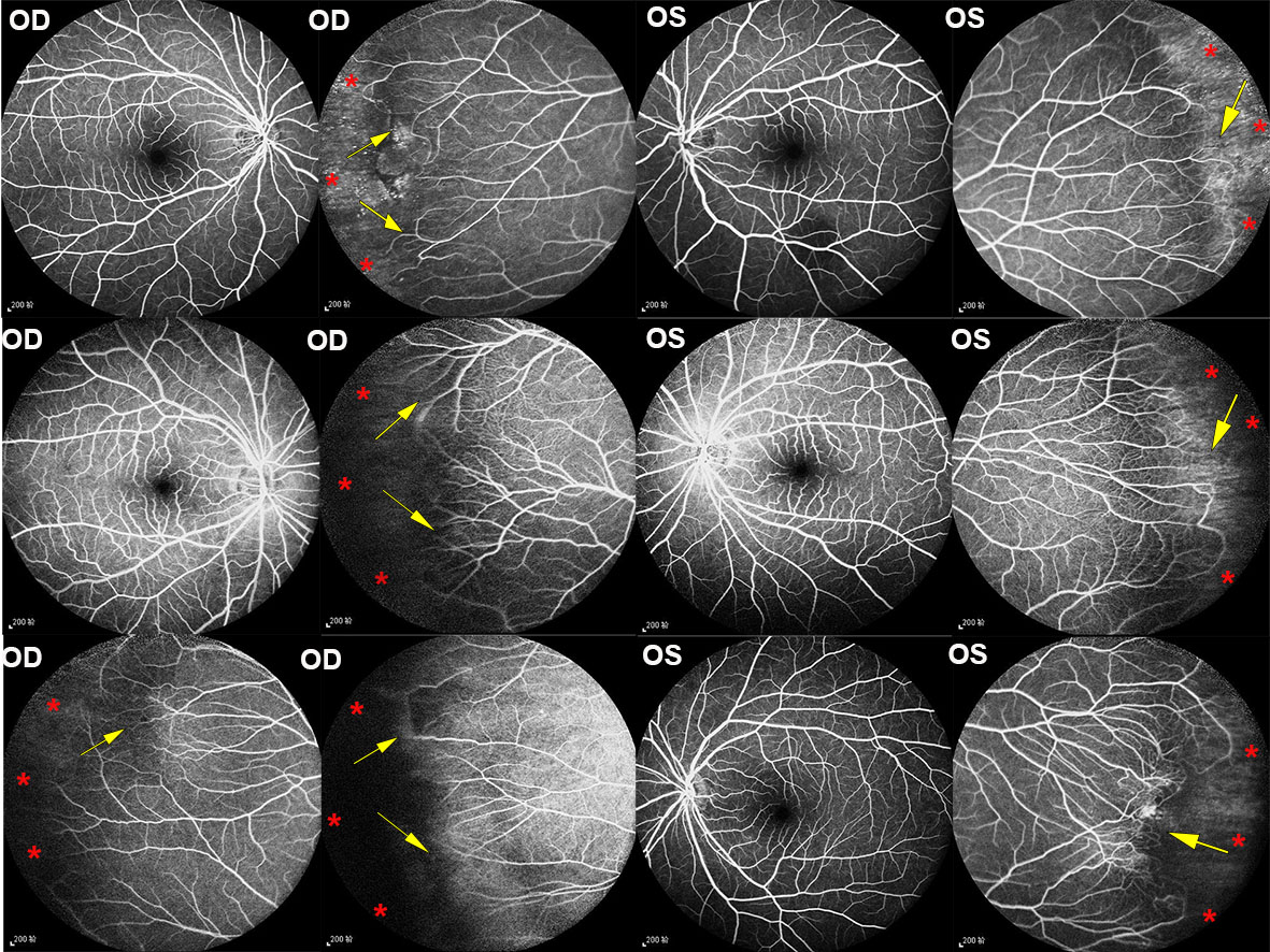 area (red asterisk) and peripheral aberrant vascularization (yellow arrow) were detected after the fluorescein angiography