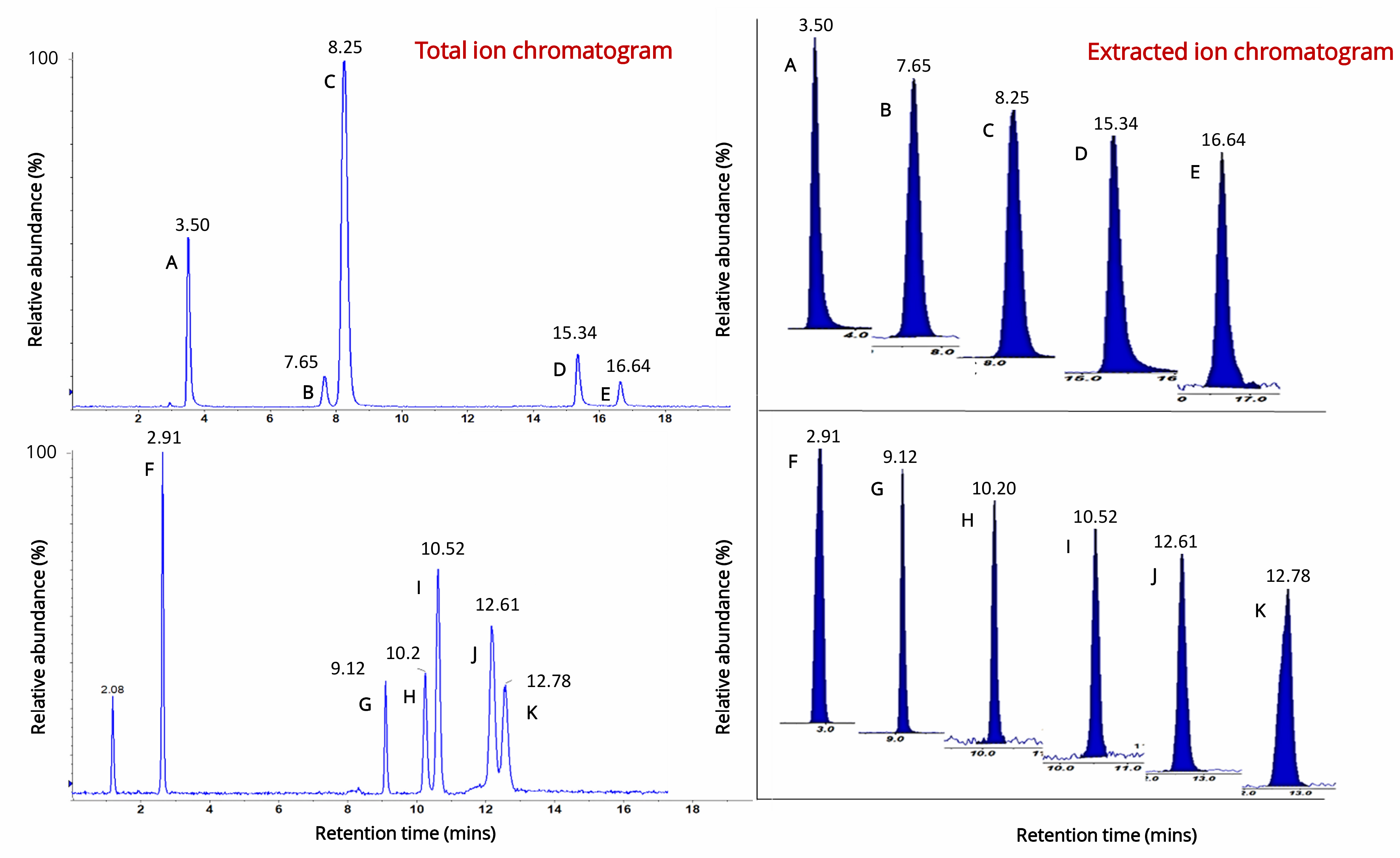 Figure 1. The figure depicts the total and extracted ion chromatograms of the analytes quantified in the adopted method: A) acetyl choline, B) γ-aminobutyric acid (GABA), C) L-glutamate, D) 1-methyl histamine, E) histamine, F) N-acetyl serotonin, G) serotonin, H) dopamine, I) adrenaline, J) L-DOPA, and K) noradrenaline.