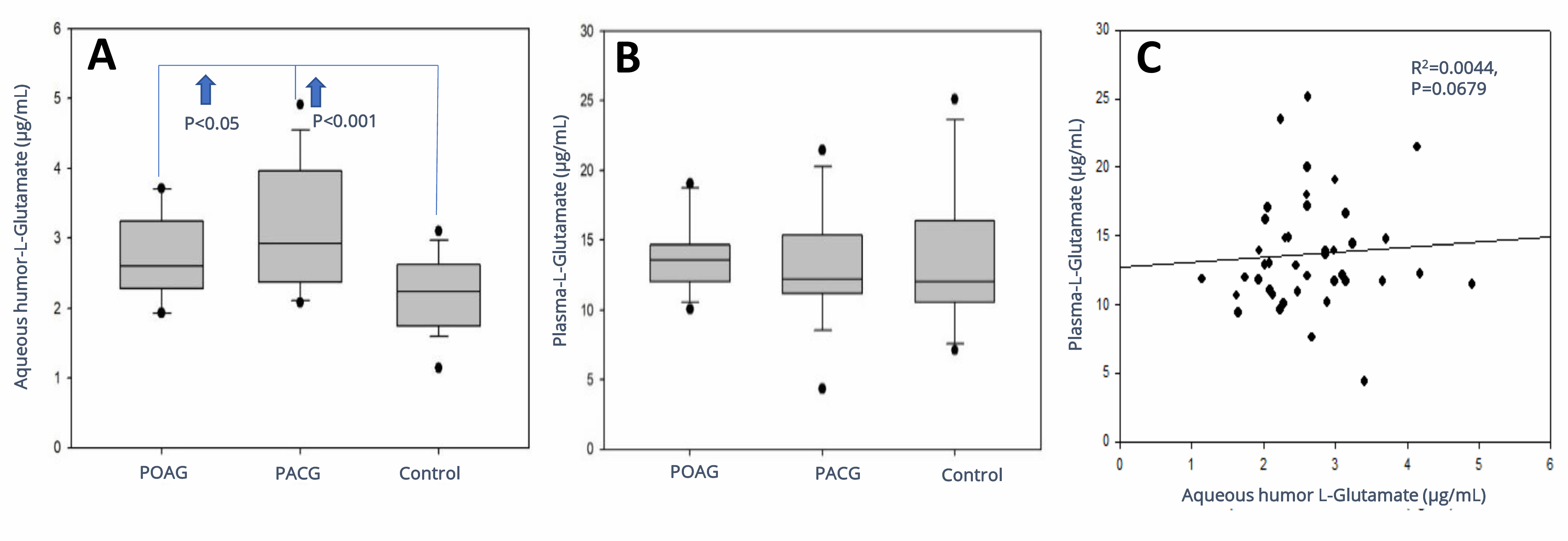group, and C) linear correlation analysis of the aqueous humor and plasma L-glutamate levels collected among the same patients in this