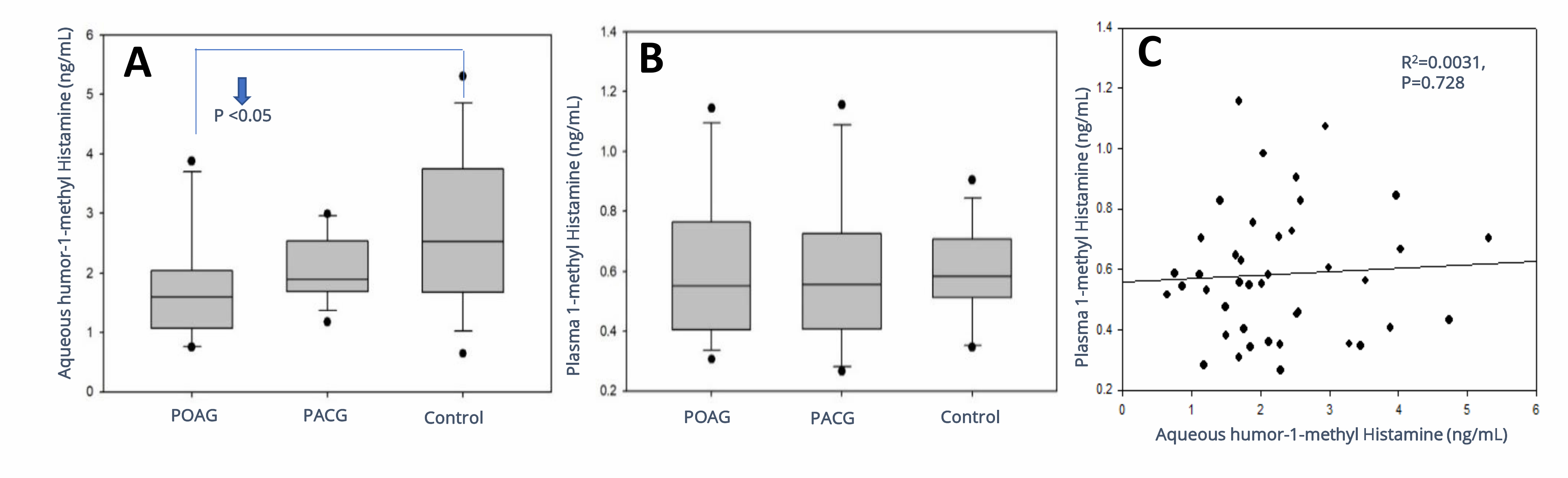 group, and C) linear correlation analysis of the aqueous humor and plasma 1-methyl histamine levels collected among the same patients