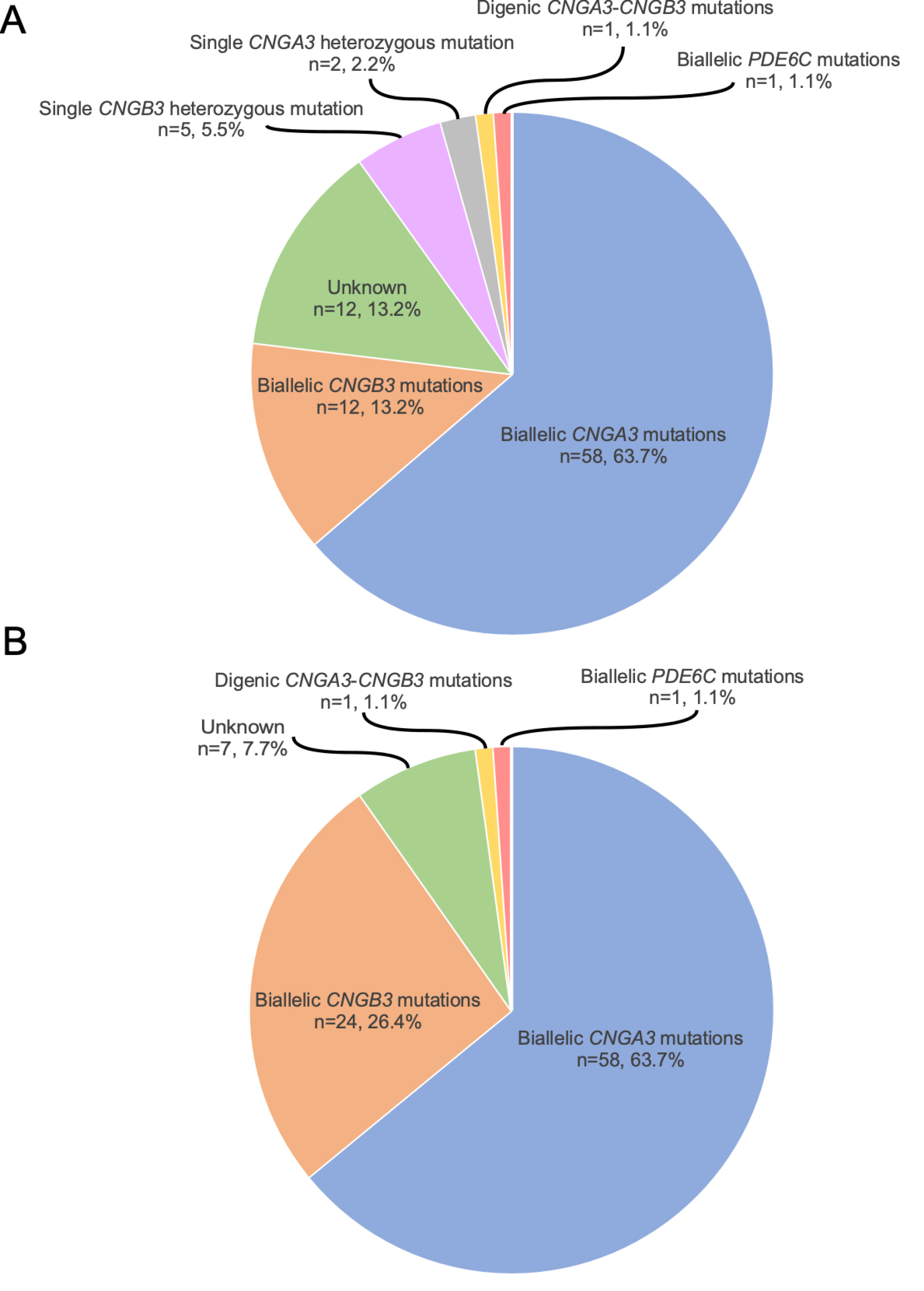 Figure 1. Distribution of achromatopsia causative genes before (A) and after (B) the identification of the CNGB3 c.1663–1205G>A variant. CNGB3 c.1663–1205G>A is one of the two common CNGB3 mutations in our cohort. The letter “n” represents the number of families, and this number is followed by their proportion