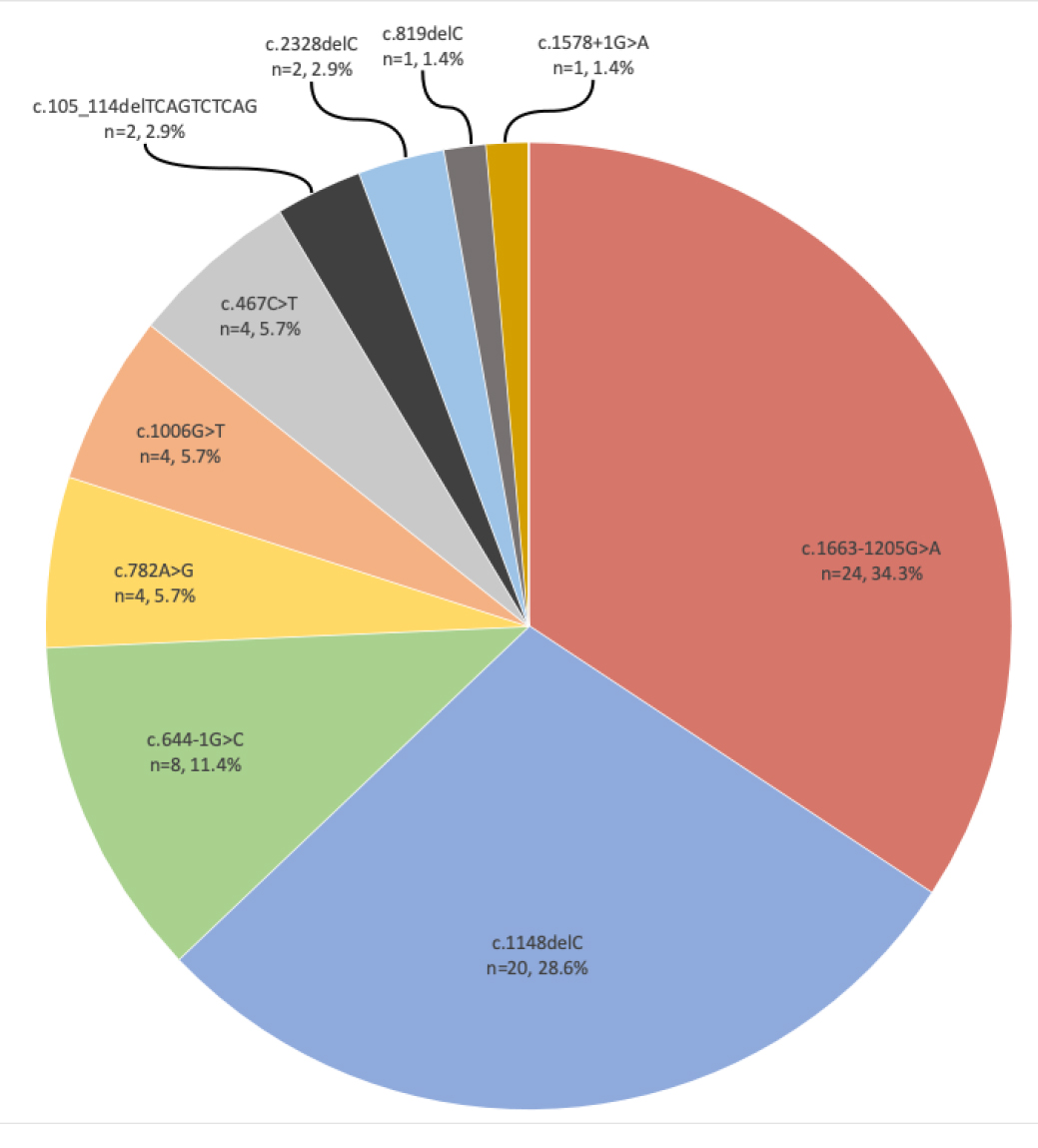 Figure 2. The distribution of CNGB3 causative variants in our cohort. The CNGB3 c.1663ā1205G>A variant is the most common (34.4% out of all CNGB3 pathogenic alleles), whereas the panethnic mutation, c.1148del, has been identified in 28.6% of alleles. The letter ānā represents
