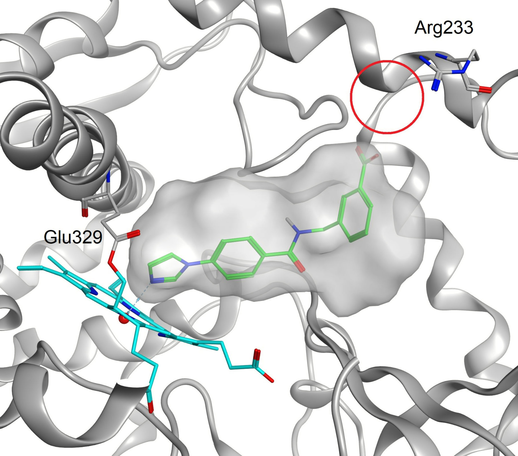 of the heme) but is too far from Arg233 to interact. The lack of interaction between inhibitor 9 and Arg 233 is illustrated