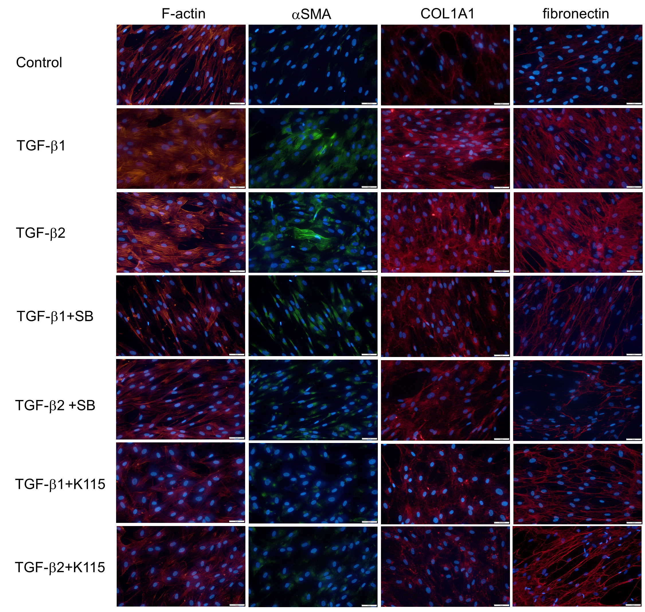 inhibitor. The panels show cells stained for F-actin (red), α-SMA (green), COL1A1 (red), and fibronectin (red) merged with