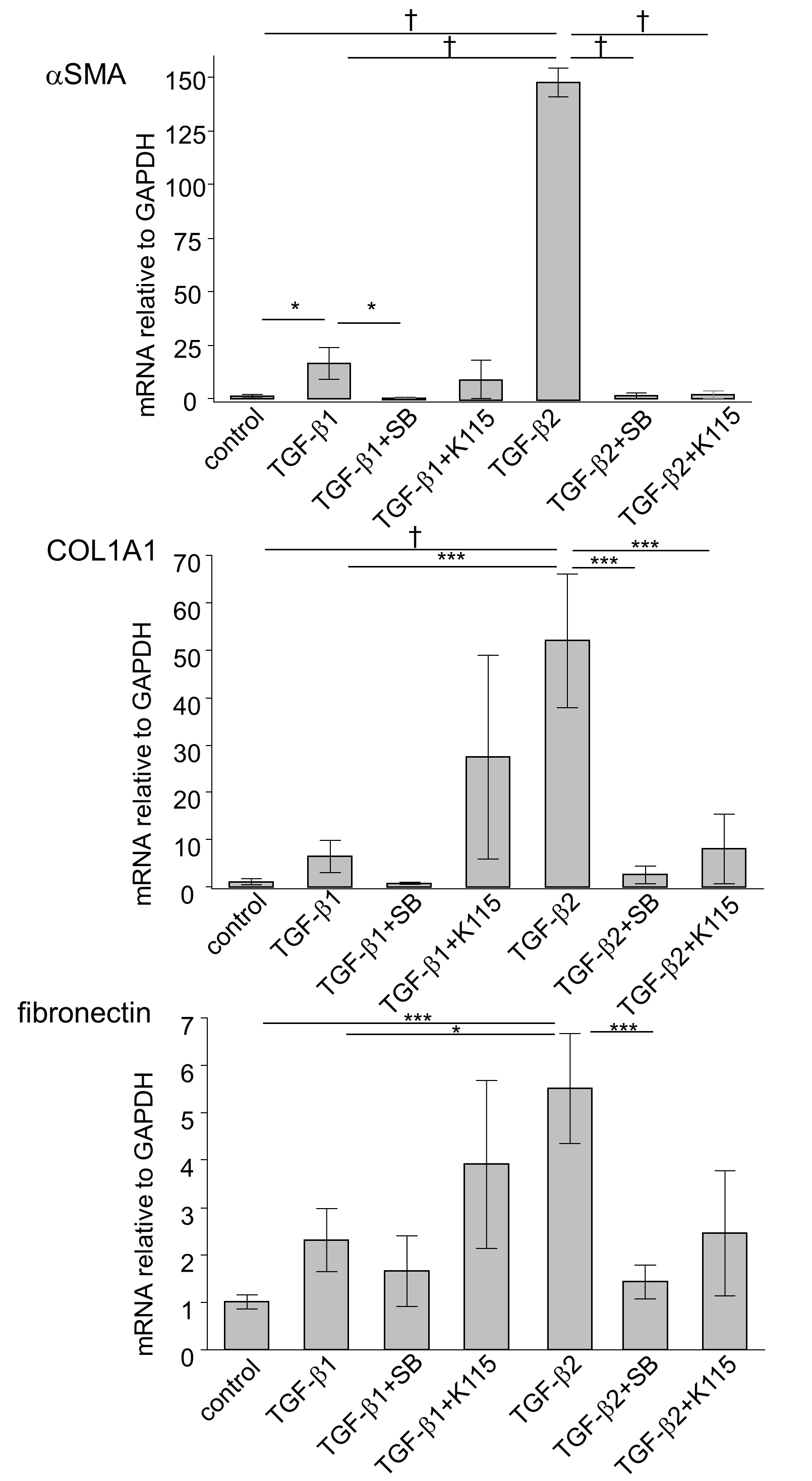 Figure 3. RT-qPCR quantification of TGF-β1 and TGF-β2-induced fibrotic changes in hTM cells α-SMA, COL1A1, and fibronectin mRNA expression