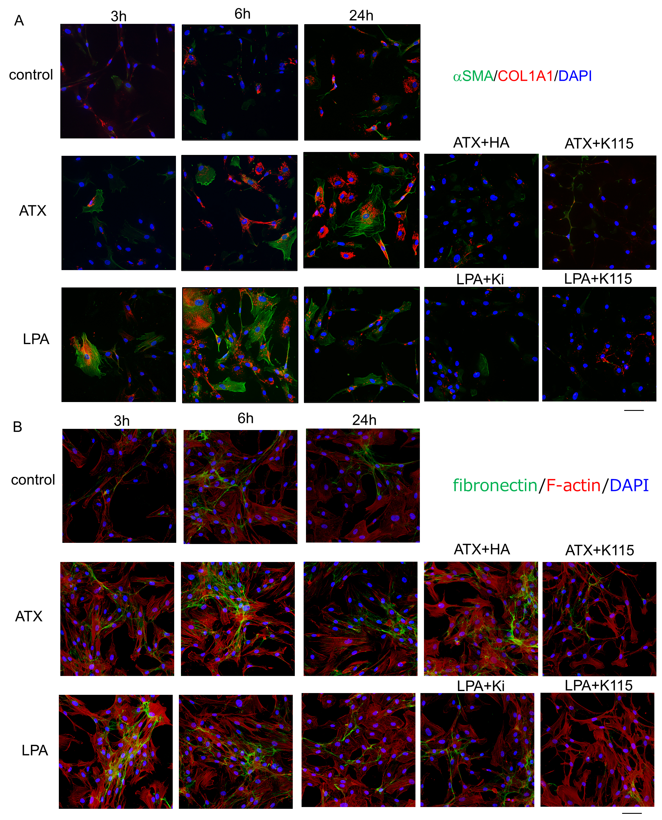 h after treatment with 40 μM autotaxin (ATX) or 10 μM lysophosphatidic acid (LPA). LPA induced upregulation of α-SMA or COL1A1