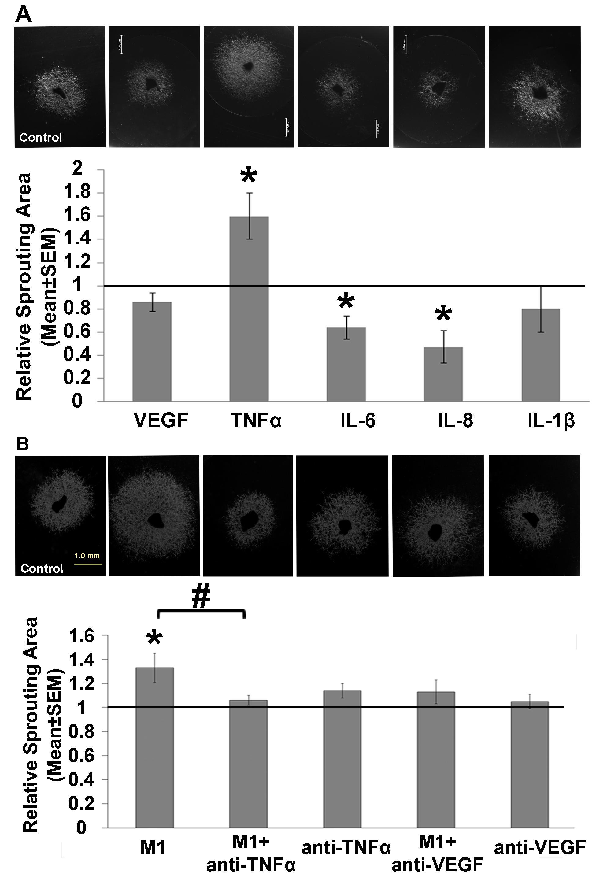 Figure 1. Select cytokines and M1 macrophages affect choroid sprouting. Sprouting was measured using an inverted microscope and is expressed