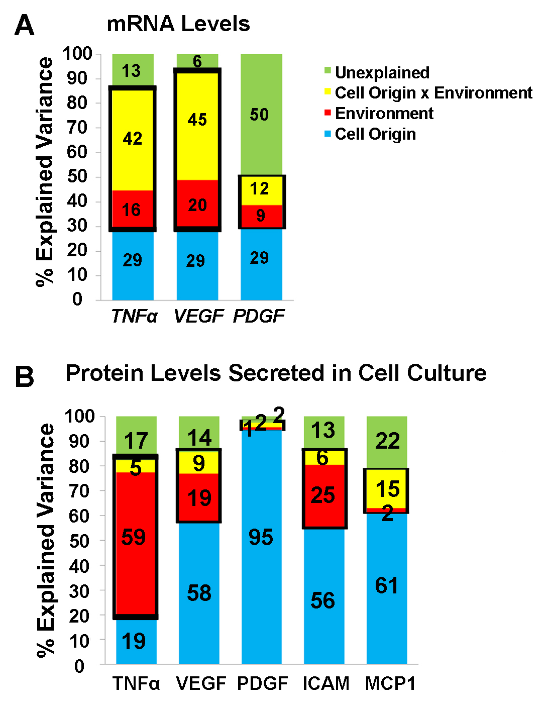 Figure 3. Summary of the factors that explain the variance in cytokine expression at the mRNA and protein levels. A: A mixed-design ANOVA with repeated measures was used to evaluate the effect of cell origin (blue), environment (red), and