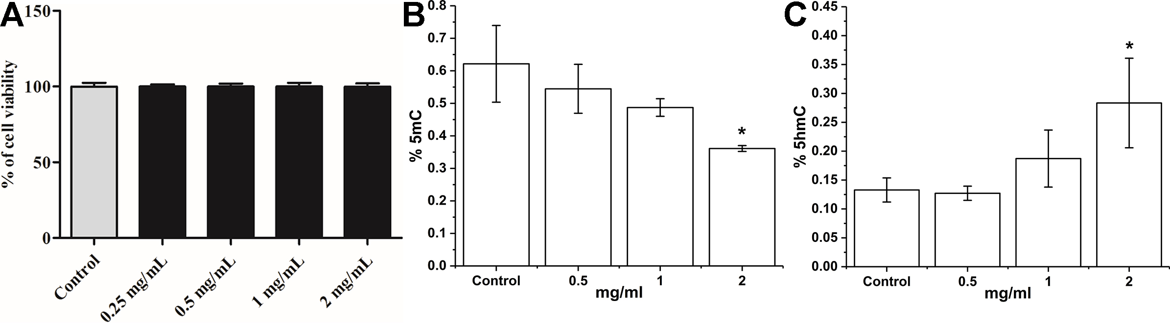 concentrations of dexamethasone (DEX). No significant changes in cell viability were observed. B: Changes in the genomic DNA methylation level of ARPE-19 cells exposed to 0.5, 1.0, and 2.0 mg/ml DEX after 48 h. C: Changes in the genomic DNA hydroxymethylation level of ARPE-19 cells exposed to 0.5, 1.0, and 2.0 mg/ml of DEX after 48
