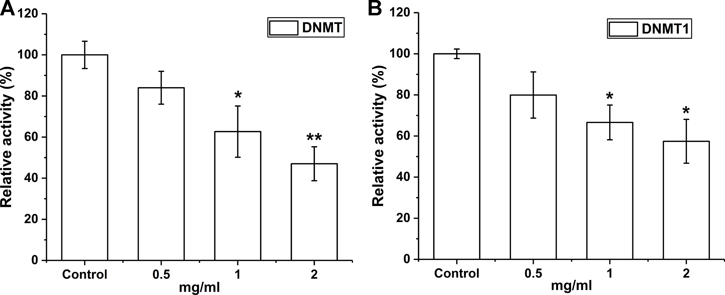 Figure 3. DEX exposure reduces DNMT enzymatic activity in vitro. Relative enzymatic activity of (A) DNA methyltransferases (DNMTs) and (B) DNMT1 from purified human DNMTs. Upon dexamethasone (DEX) exposure, the activity of the DNMTs was inhibited. (Data are shown
