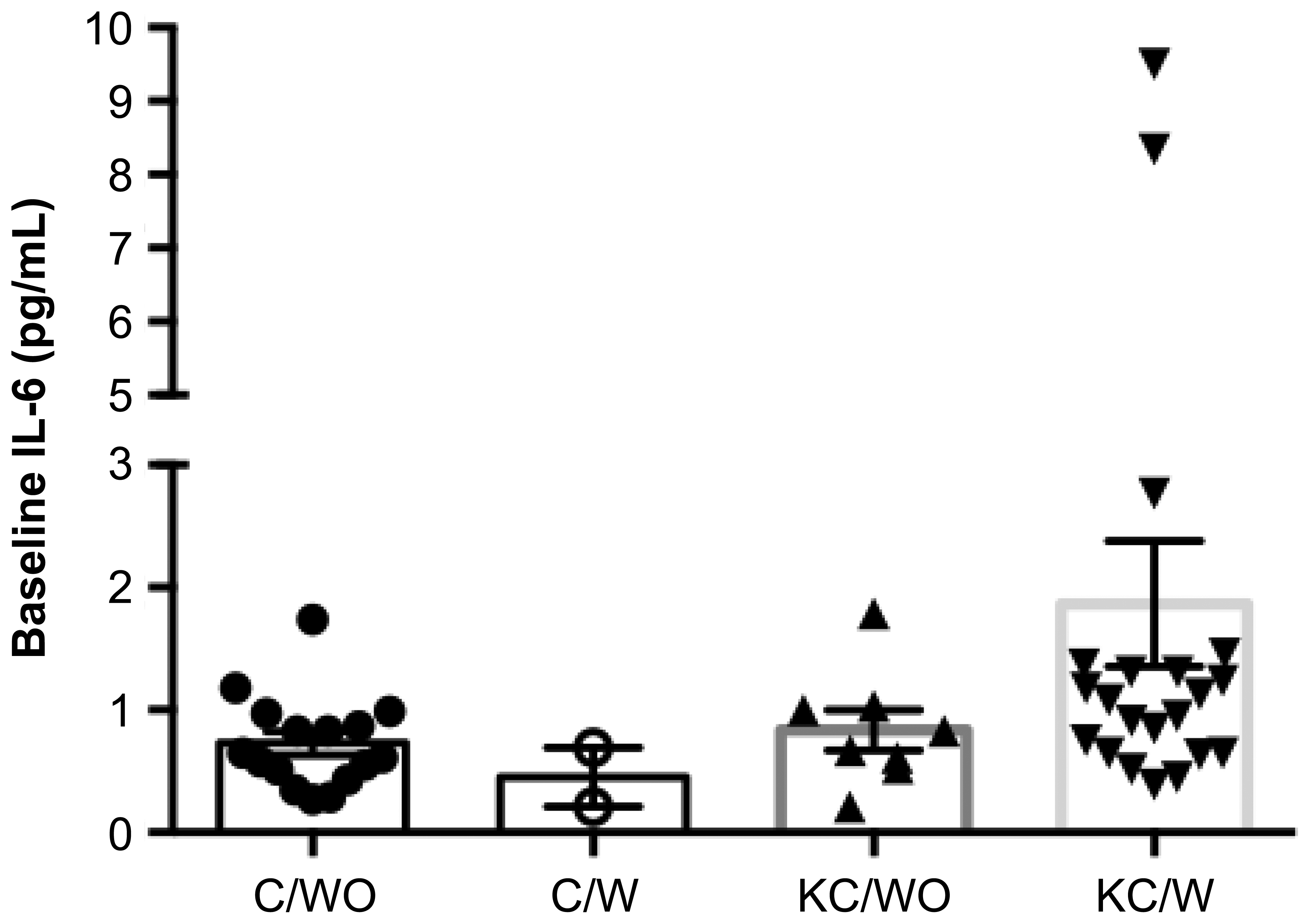 IL-6 levels in KC and control groups according to ocular allergy at baseline (p = 0.003).