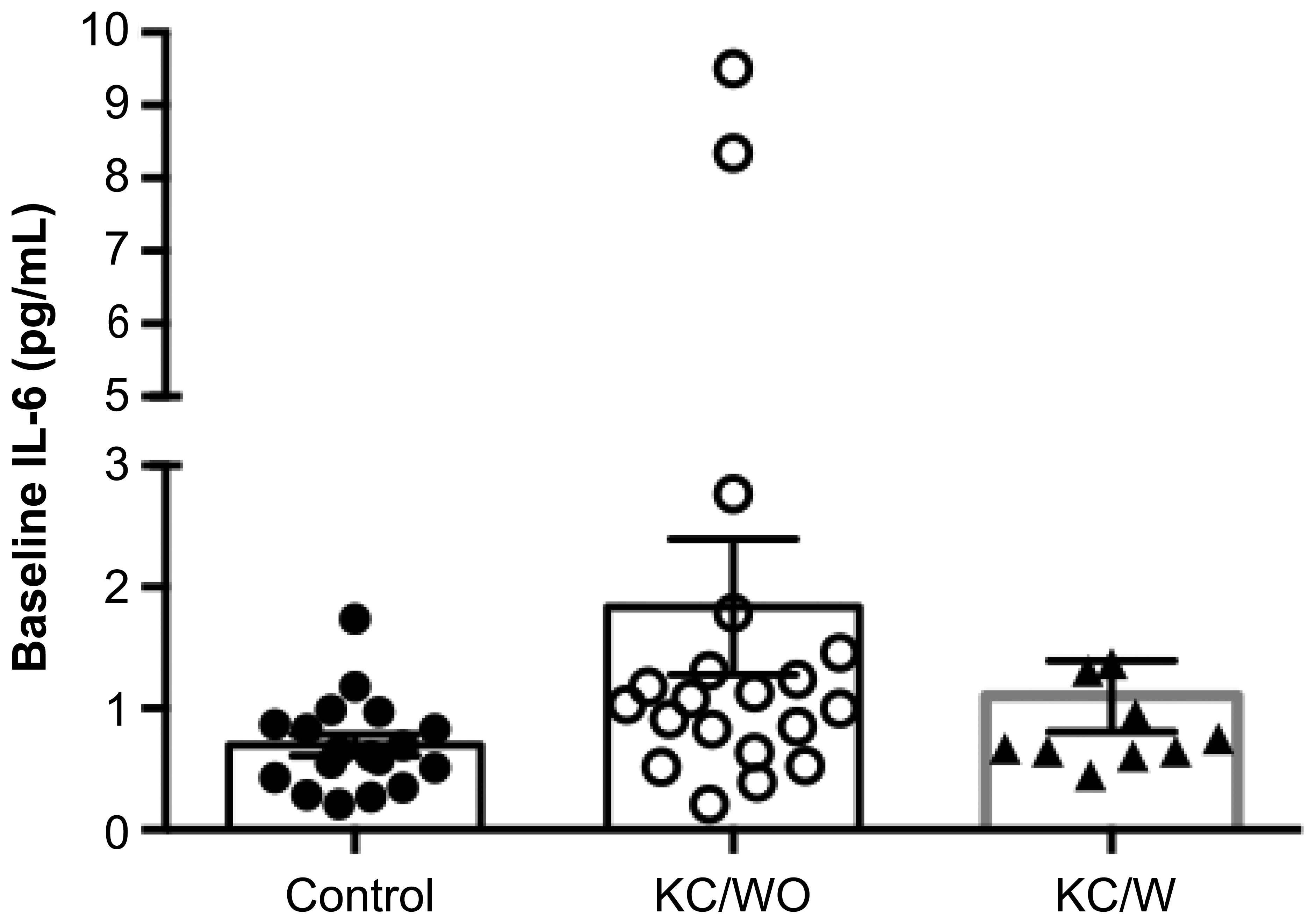 IL-6 levels between control and KC groups with and without progression at baseline (p = 0.032).
