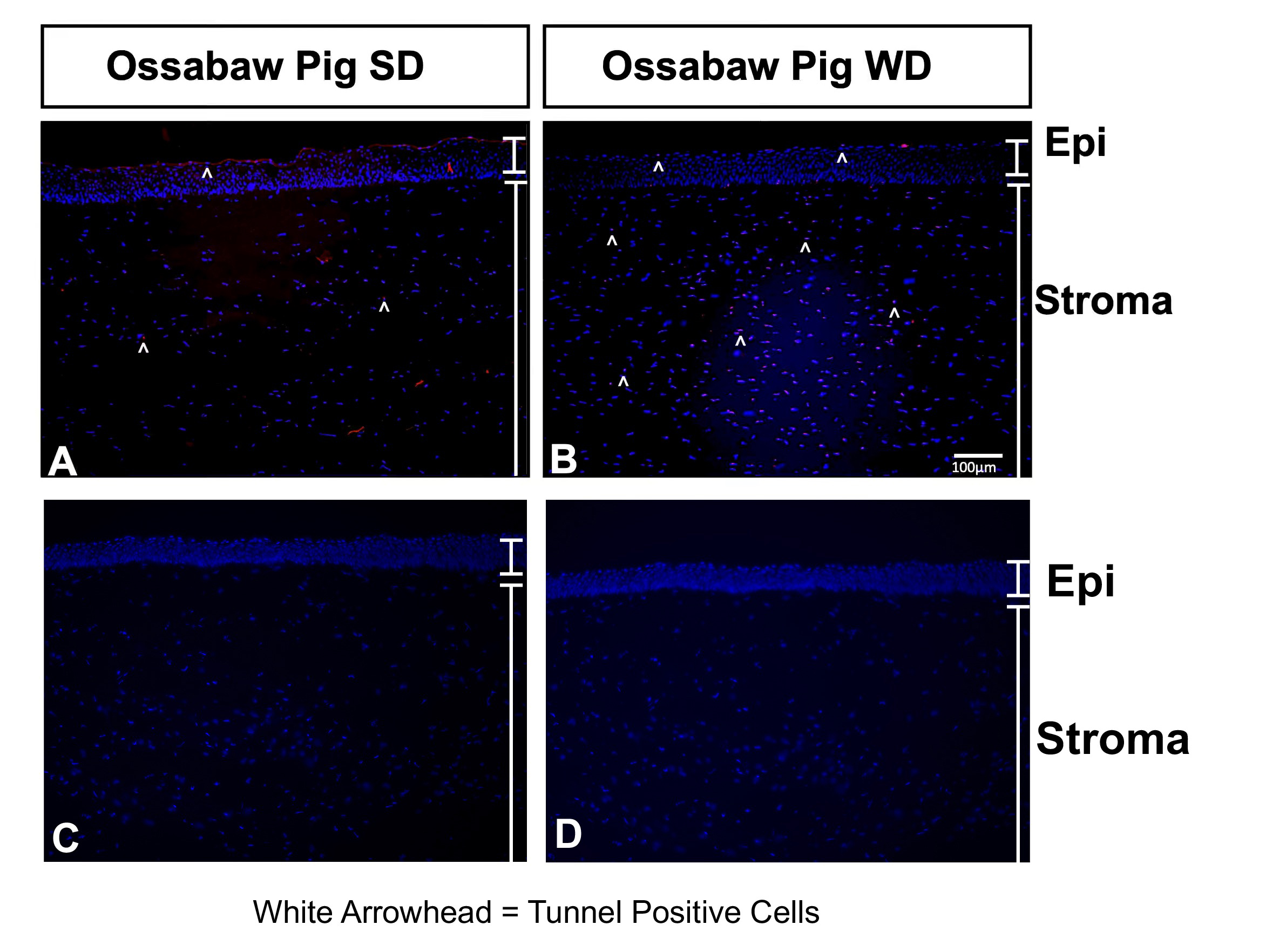 Figure 2. Tunnel assay indicates an increase in Tunnel-positive cells (white arrowheads) in the Western diet (WD) fed Ossabaw mini pigs