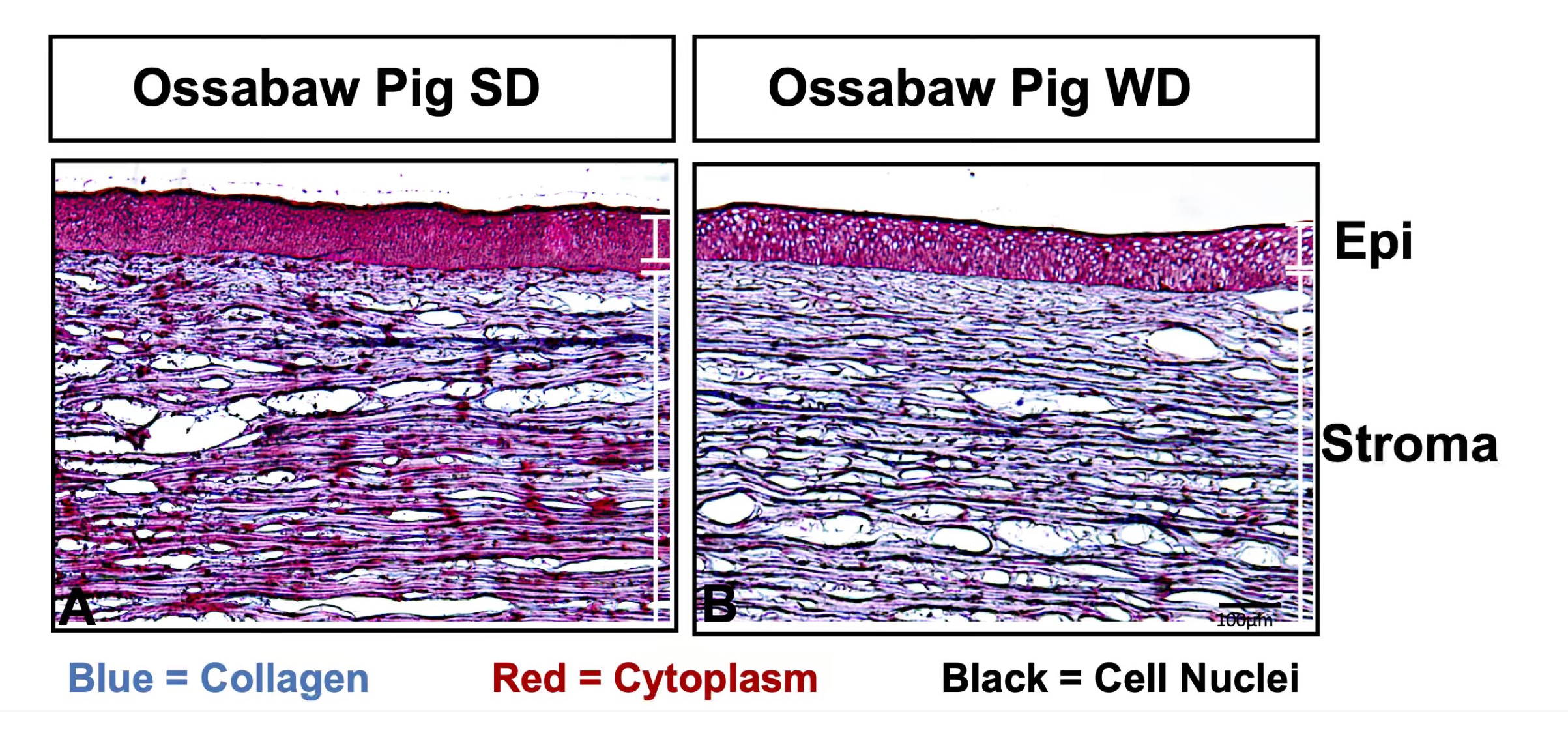 Figure 3. Mason trichome staining depicts cell nuclei (black), cytoplasm (red), and collagens (blue). The Western diet (WD) fed Ossabaw