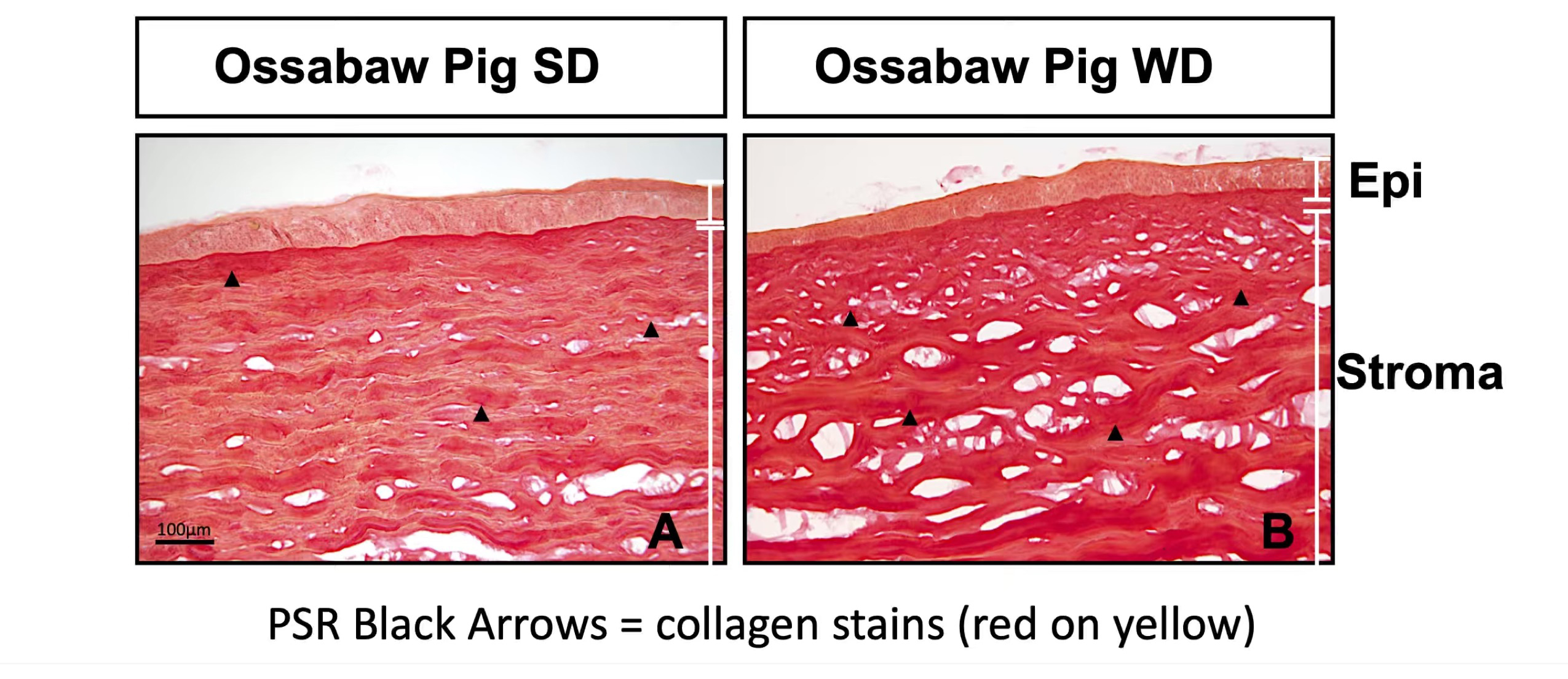 Western diet (WD) fed pig corneal section (B) shows high numbers of irregular collagen compared to the Standard diet (SD) fed pigs (A).