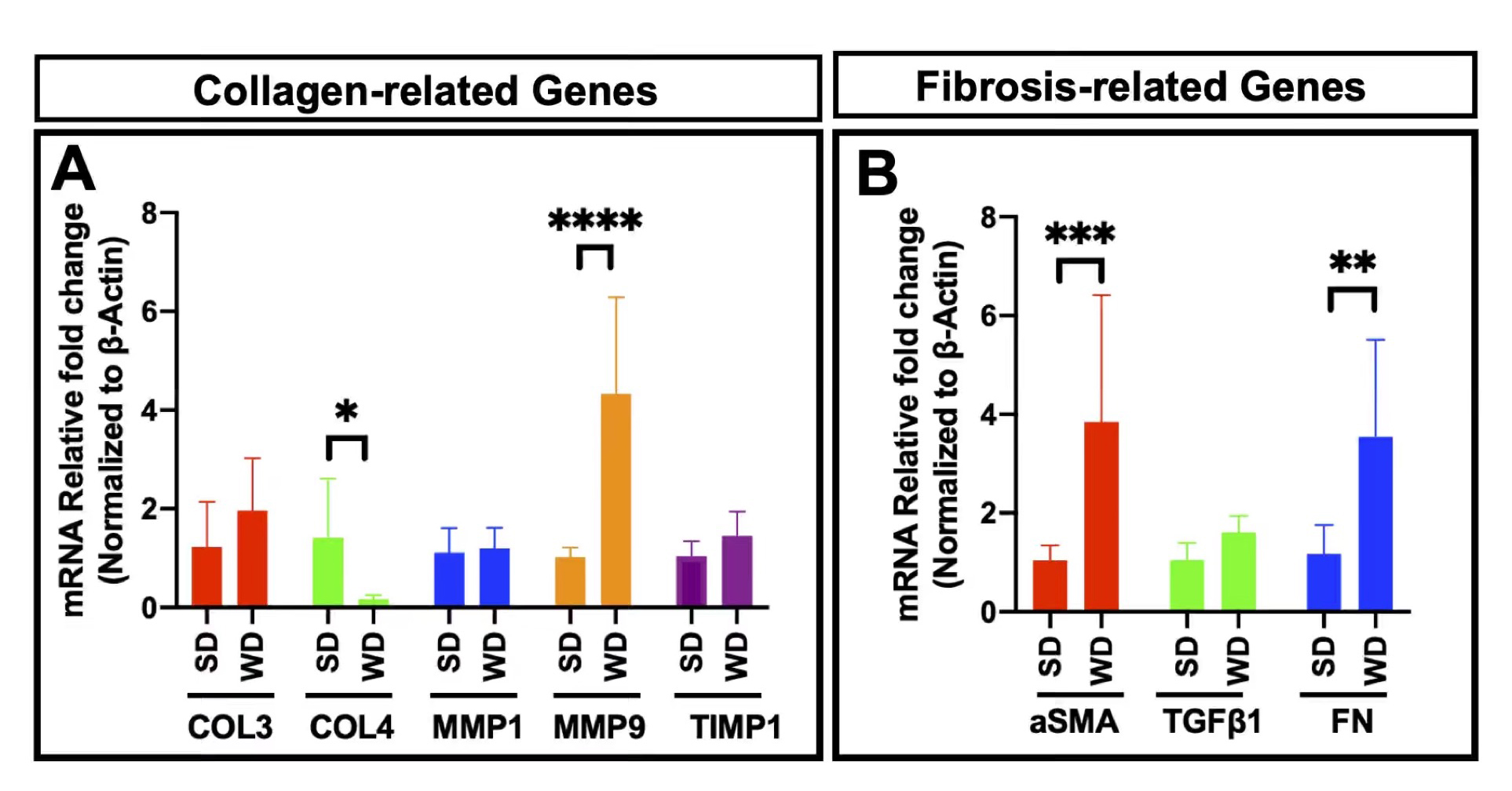 Figure 8. Gene expression in the Western diet (WD) fed and Standard diet (SD) fed Ossabaw pig corneas. A represents collagen-related genes- collagen 3 (COL 3), collagen 4 (COL 4), metalloproteases 1 (MMP1), metalloproteases 9
