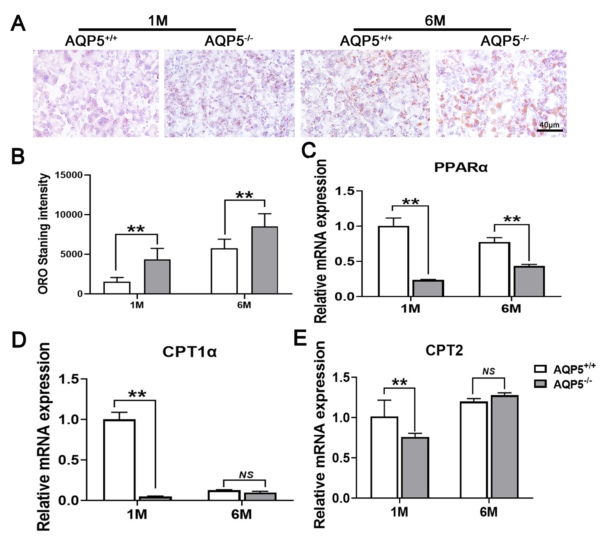 Figure 3. AQP5−/− induced abnormal lipid metabolism in the lacrimal gland. A: Oil Red O (ORO) staining (n = 6 samples). B: ORO staining intensity analyzed by ImageJ software (n = 6 samples). C,D,E: Real-time PCR analyzed the expression of PPARα, CPT1α, and CPT2 (n = 3 samples). *p<0.05, **p<0.001, two-way analysis of variance (ANOVA). Scale bars: (A) 40 μm. * p<0.05, ** p<0.01, ***
