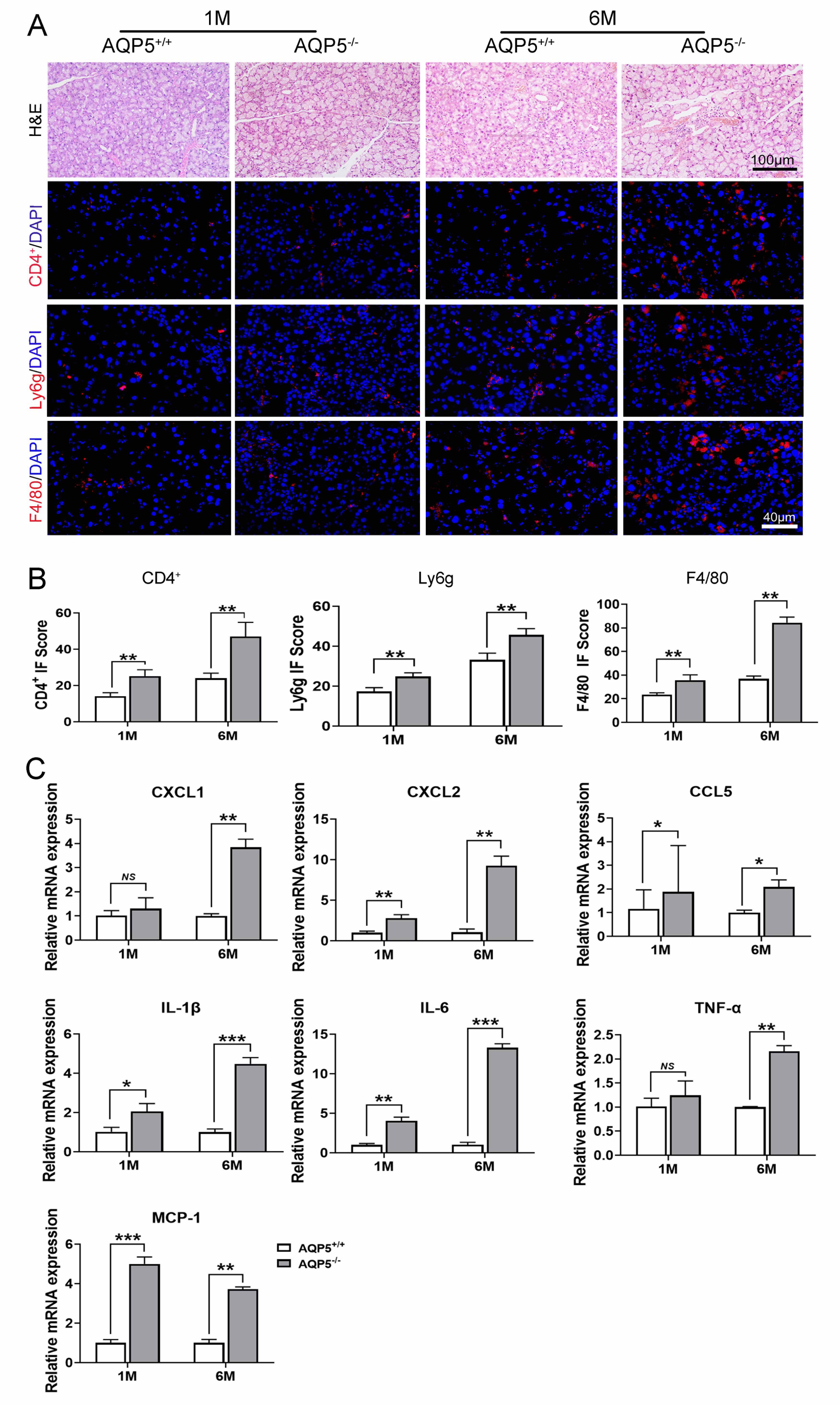 Figure 4. AQP5 deficiency induced inflammation in the lacrimal gland. A: Hematoxylin and eosin (H&E) staining showed morphology changes. CD4+: Immunofluorescence staining of CD4+ demonstrated CD4+ T cells (red: CD4+, blue: 4’6-diamidino-2-phenylindole [DAPI]). Ly6g: Immunofluorescence staining of Ly6g showed neutrophils (red: Ly6g, blue: