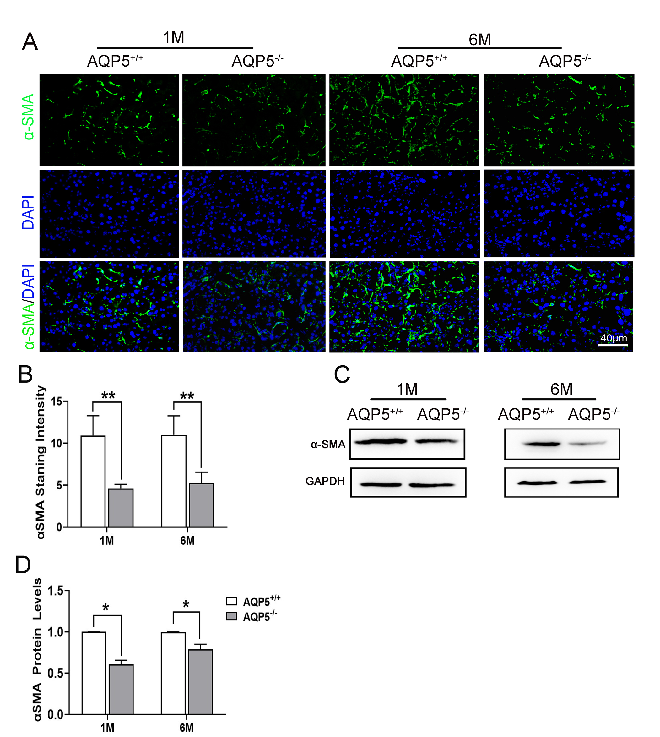 Figure 5. AQP5 deficiency induced structural damage to lacrimal gland myoepithelial cells (MECs) in mice. A: Immunofluorescence staining of alpha-smooth muscle actin (α-SMA) showed myoepithelium morphology (green: α-SMA; blue: 4’6-diamidino-2-phenylindole