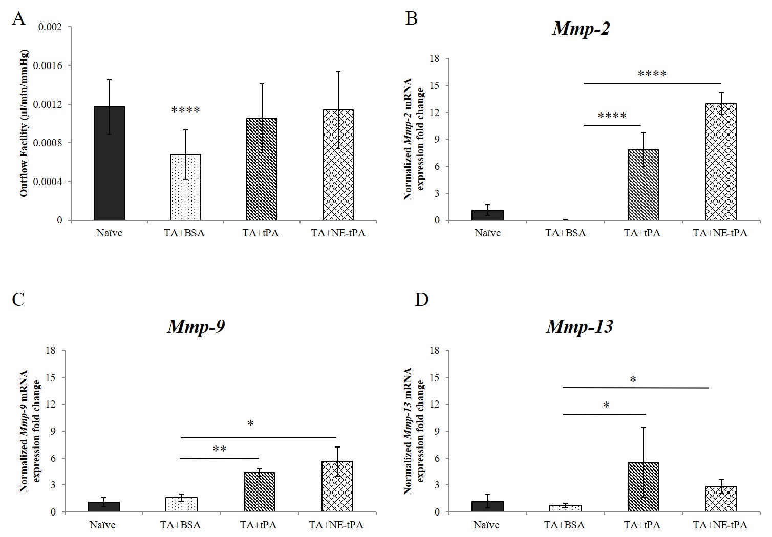 and NE-tPA-treated eyes. Gene expression changes in Mmp-2 (B), Mmp-9 (C), and Mmp-13 (D) were normalized (mean ± SD) to values from naïve eyes. Group means were significantly different in TA+BSA eyes (n = 4),