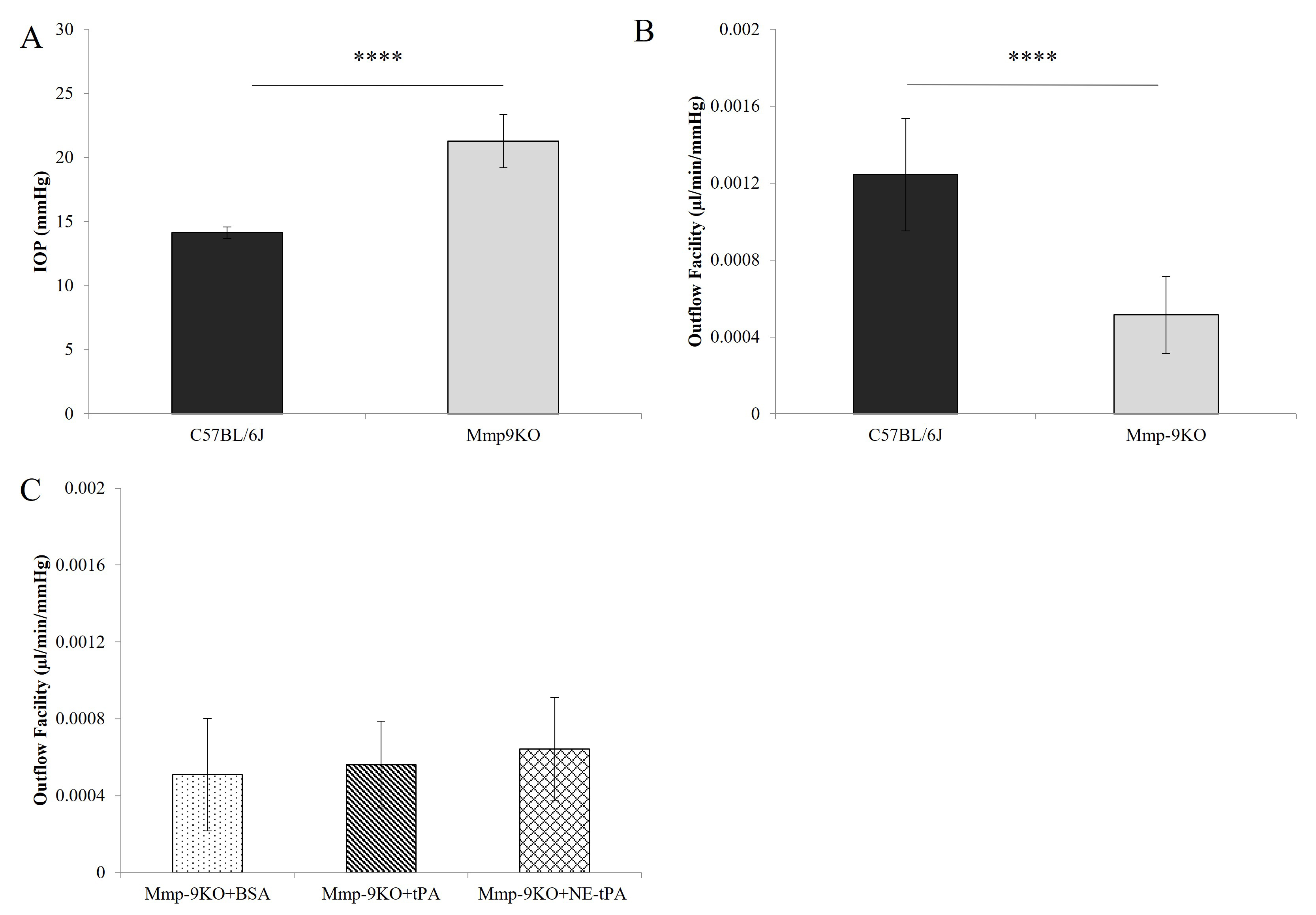 Figure 8. Protein treatment did not affect outflow facility in Mmp-9KO mouse eyes. A: Intraocular pressure in Mmp-9KO and C57BL/6 mouse eyes. Intraocular pressure (mean ± SD mmHg) in Mmp-9KO mouse eyes (n = 20) was significantly higher than that of C57BL/6J animals (n = 20; **** p<0.0001, t test). B: Outflow facility in Mmp-9KO and C57BL/6 mouse eyes. Outflow facility (mean ± SD µl/min/mmHg) in Mmp-9KO mouse eyes (n = 14) was significantly lower than that of C57BL/6J animals (n = 16; **** p<0.0001, t test). C: Outflow facility in BSA-, tPA-, and NE-tPA-treated Mmp-9KO mouse eyes. Outflow facility (mean ± SD µl/min/mmHg) was not significantly different across groups: Mmp-9KO+BSA (n = 21), Mmp-9KO+tPA (n = 13), and Mmp-9KO+NE-tPA (n = 8; p>0.05, ANOVA).